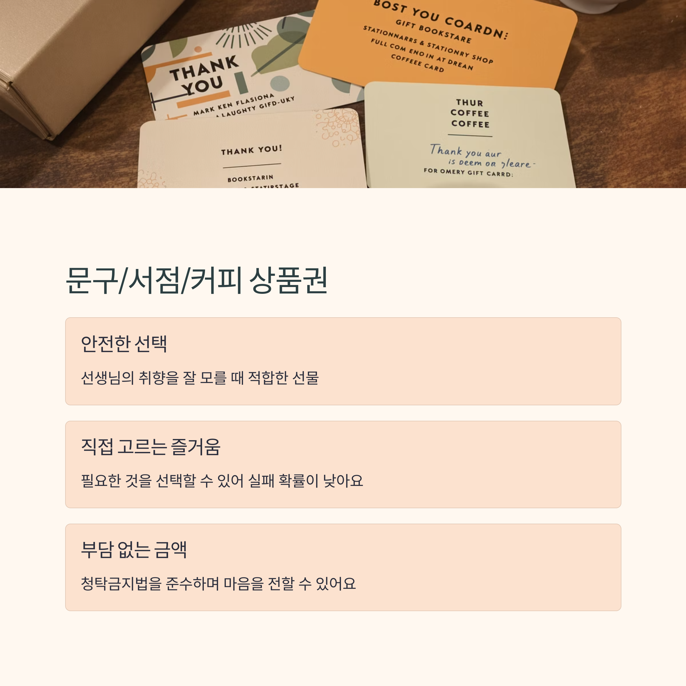 선생님의 취향을 잘 모르겠다면 가장 안전하고 실용적인 선택입니다. 필요한 것을 직접 고르실 수 있어 실패할 확률이 적습니다. 부담 없는 금액대로 마음을 전할 수 있는 효과적인 선물입니다.