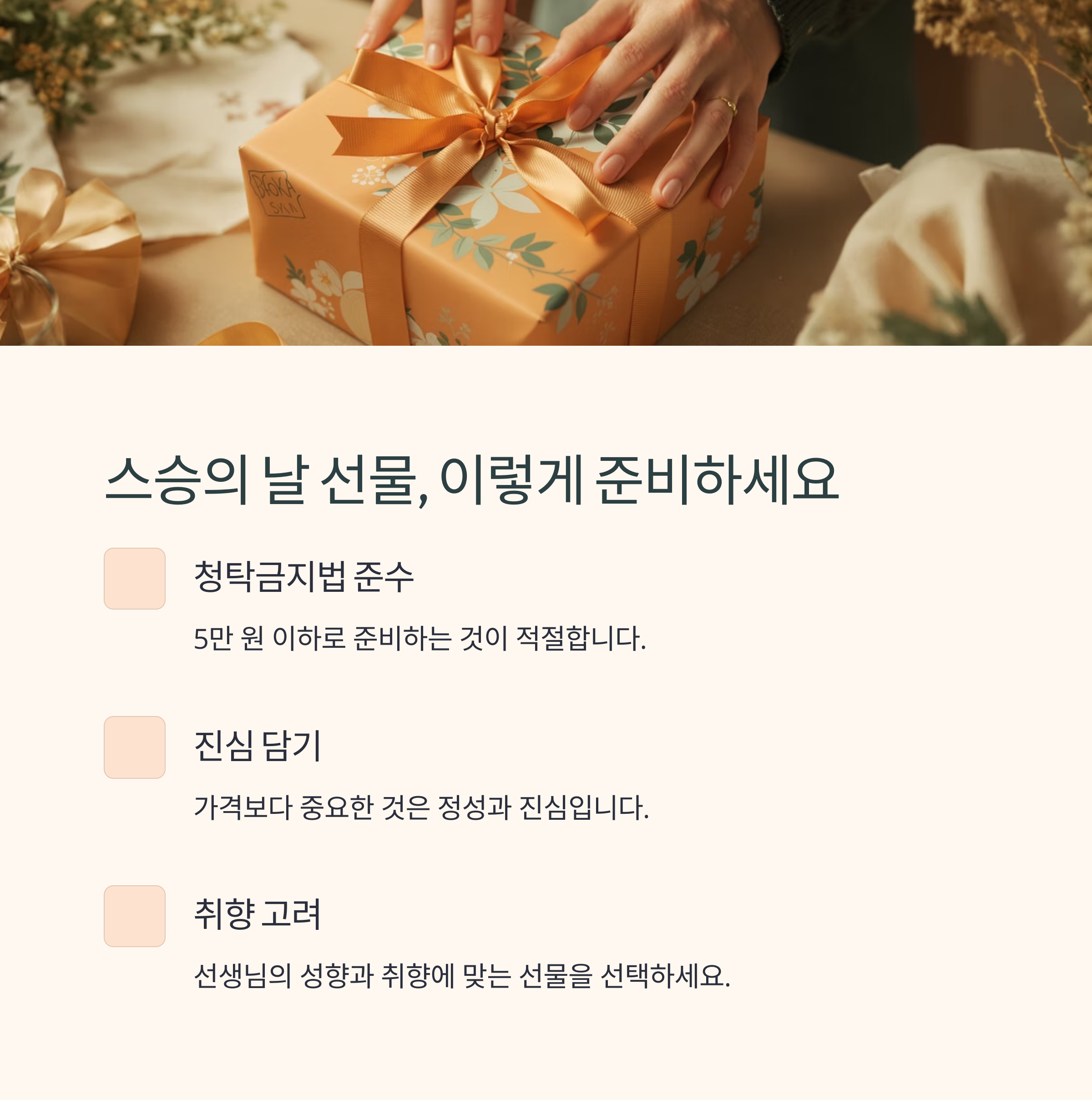 스승의날 선물은 청탁금지법 기준에 따라 5만 원 이하로 준비하는 것이 적절합니다. 하지만 가격보다 더 중요한 것은 정성과 진심입니다. 작은 선물이라도 정성스러운 포장과 손글씨 메시지를 더한다면 충분히 감동을 전할 수 있습니다.