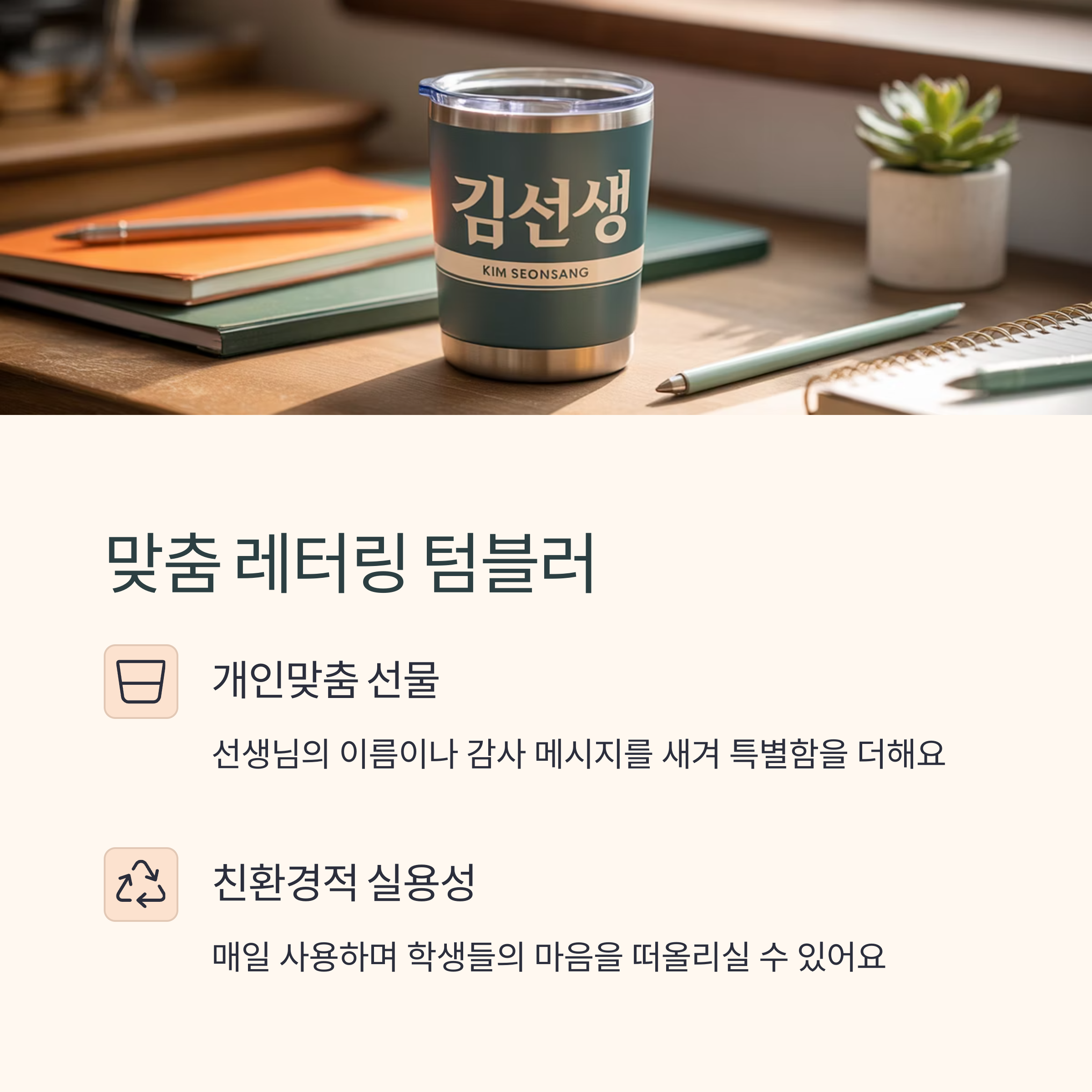 매일 사용하는 텀블러에 선생님의 이름이나 감사 메시지를 새긴 개인맞춤 선물입니다. 친환경적이면서도 실용적인 아이템으로, 사용하실 때마다 학생들의 마음을 떠올리실 수 있습니다. 다양한 디자인과 크기로 선택의 폭이 넓은 것도 장점입니다.