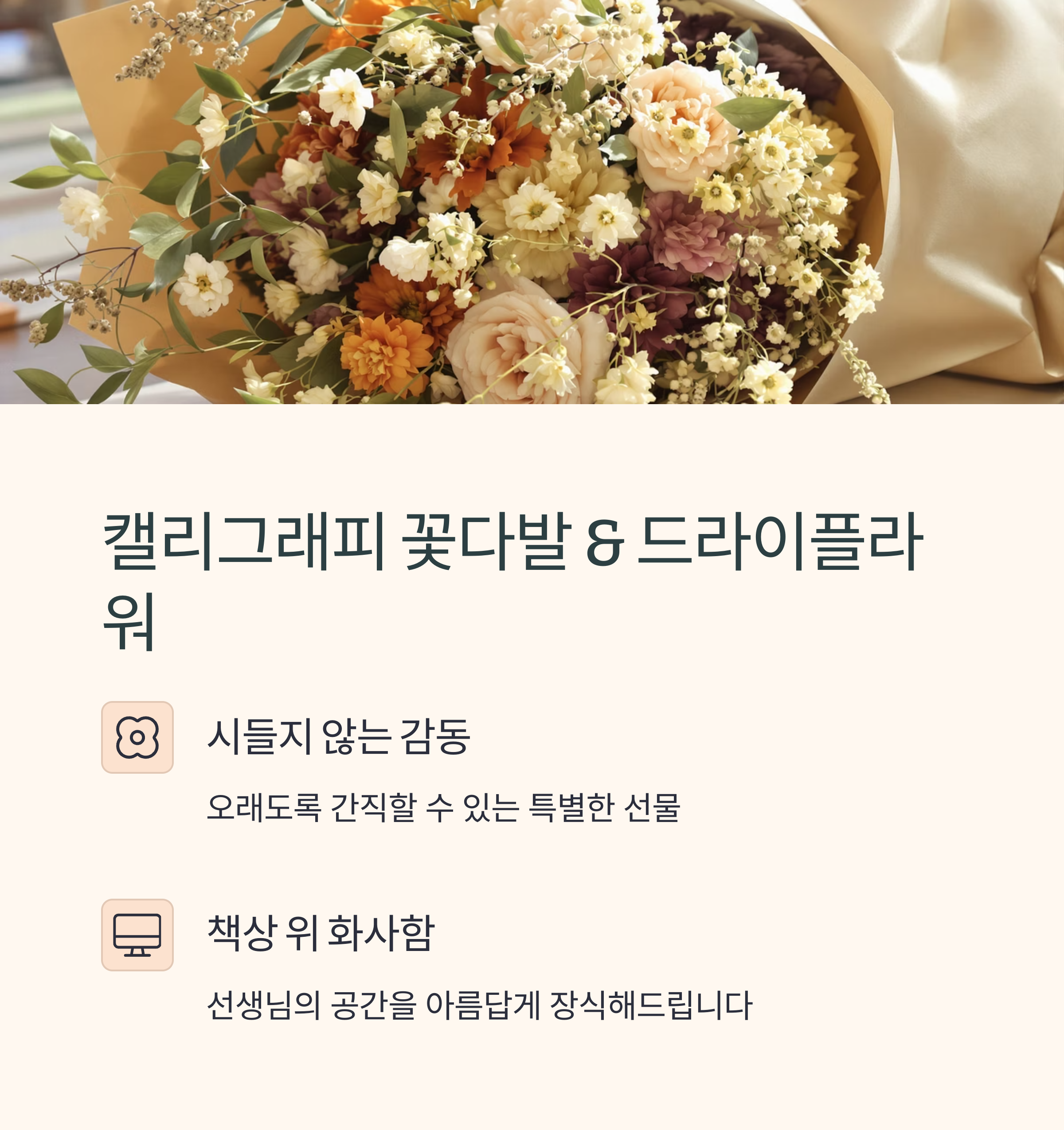 시들지 않는 꽃으로 감동을 오래도록 간직할 수 있는 선물입니다. 아름다운 손글씨가 새겨진 꽃다발이나 드라이플라워는 선생님의 책상 위를 화사하게 장식해드릴 수 있습니다. 매일 보실 때마다 학생들의 감사한 마음을 떠올리실 수 있어 의미가 깊습니다.