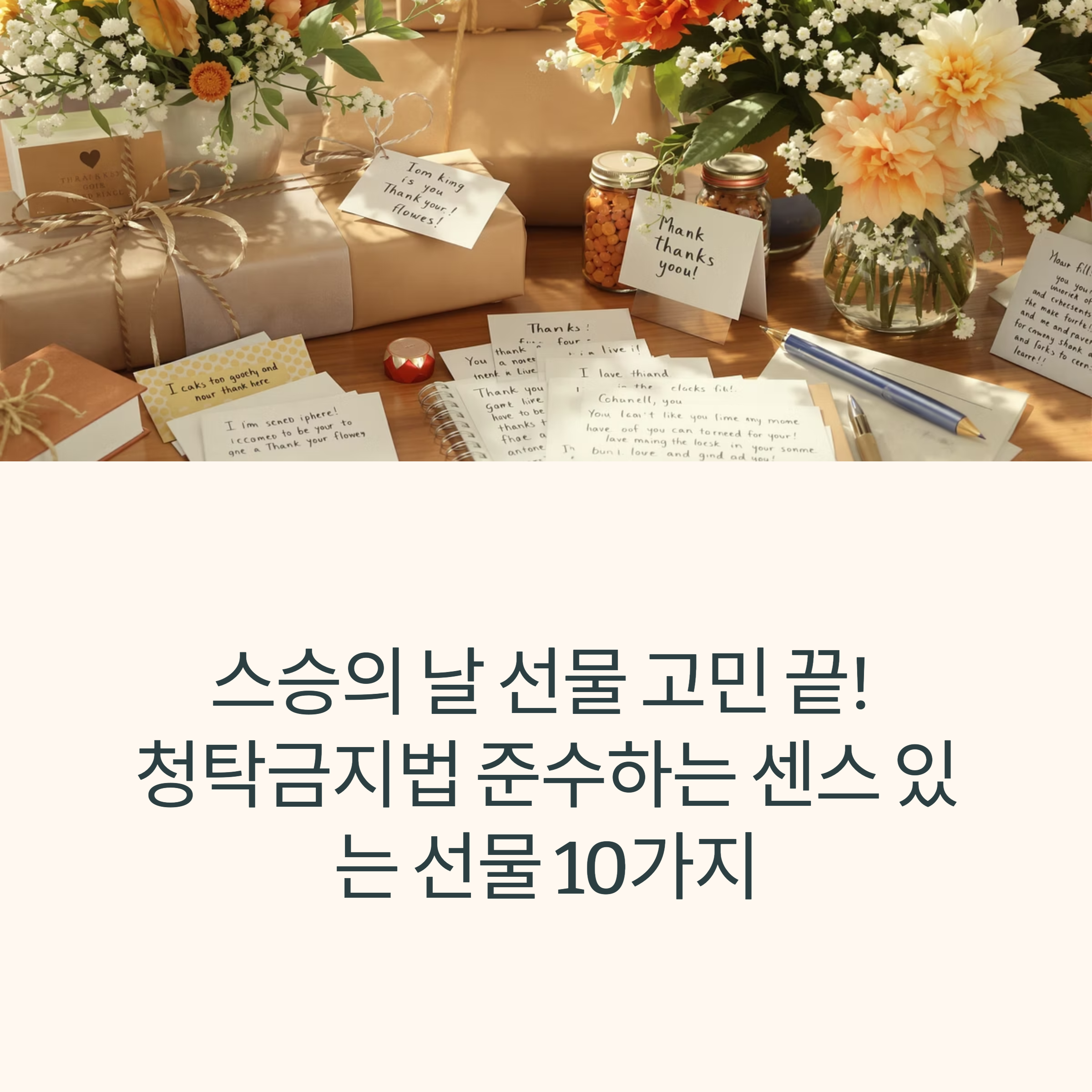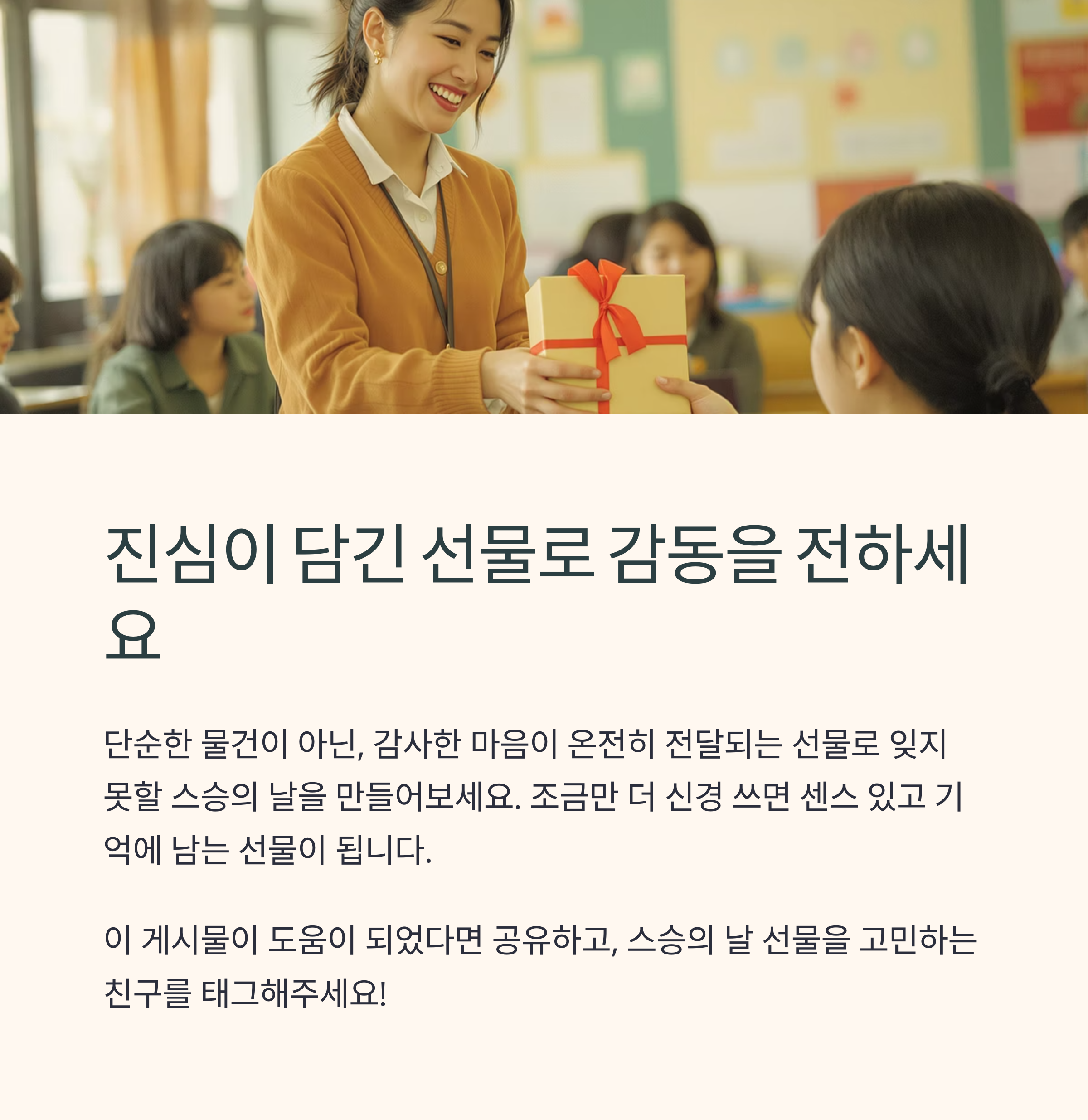 5월 15일, 스승의날이 다가오고 있습니다. 선생님께 어떤 선물을 드려야 할지 고민이신가요? 이번 글에서는 감사한 마음을 담아 부담 없이 드릴 수 있는 스승의 날 선물 best 10을 소개해드리겠습니다. 청탁금지법(김영란법)을 준수하면서도 센스 있고 진심이 담긴 아이템들로 구성했으니, 끝까지 읽어보시고 마음에 드는 선물을 골라보세요.