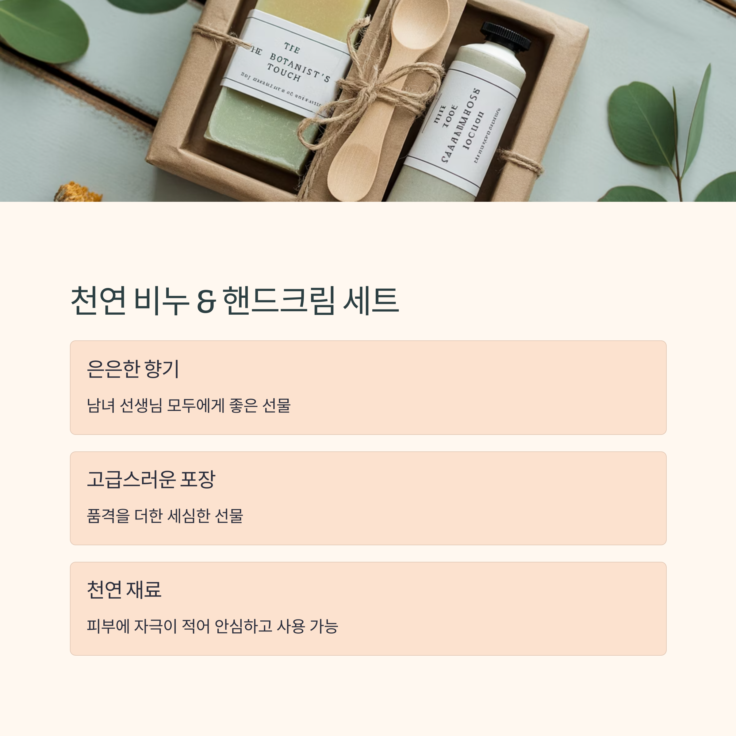 은은한 향기와 뛰어난 보습 효과로 남녀 선생님 모두에게 좋은 선물입니다. 고급스러운 포장으로 품격을 더했으며, 피부에 자극이 적은 천연 재료로 만들어져 안심하고 사용하실 수 있습니다. 실용성과 세심한 배려가 돋보이는 선물입니다.