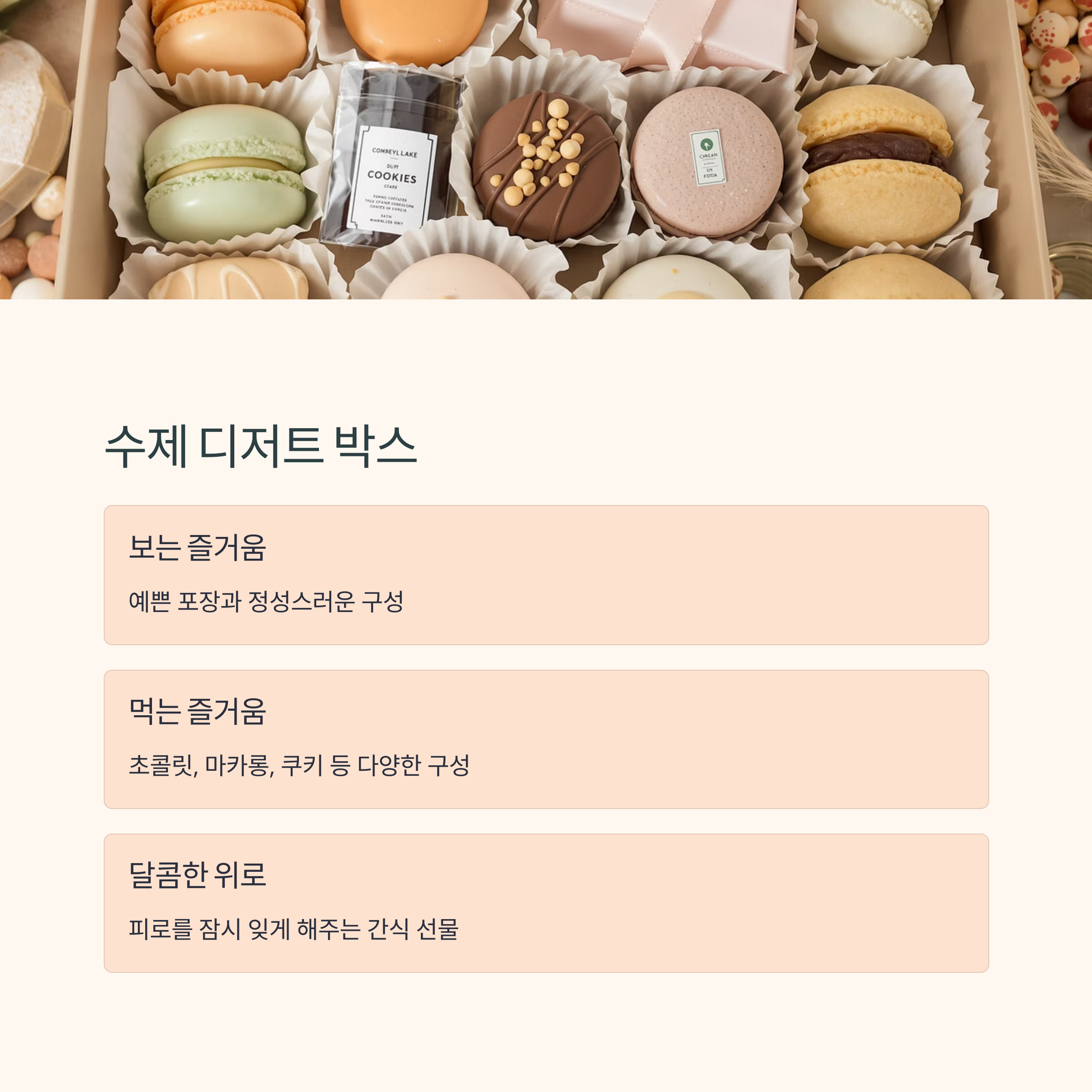 초콜릿, 마카롱, 쿠키 등으로 구성된 감성적인 수제 디저트는 보는 즐거움과 먹는 즐거움을 동시에 선사합니다. 예쁜 포장과 정성스러운 구성으로 받는 분의 만족도가 매우 높습니다. 달콤한 간식으로 피로를 잠시나마 잊으실 수 있도록 배려한 선물입니다.