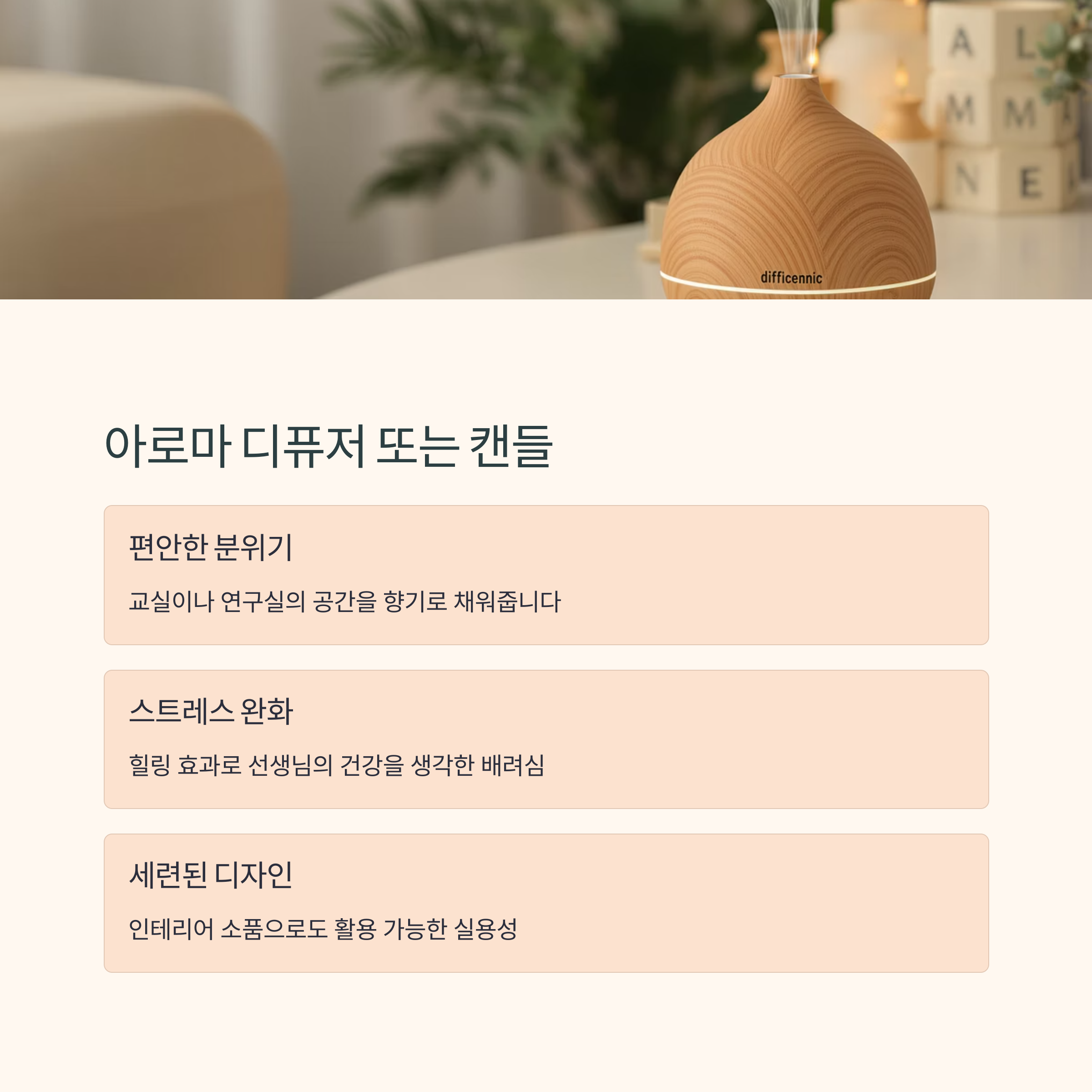 교실이나 연구실의 분위기를 한층 편안하게 만들어주는 향기 선물입니다. 스트레스 완화와 힐링 효과가 있어 선생님의 건강을 생각한 배려심이 담긴 아이템입니다. 세련된 디자인으로 인테리어 소품으로도 활용 가능합니다.