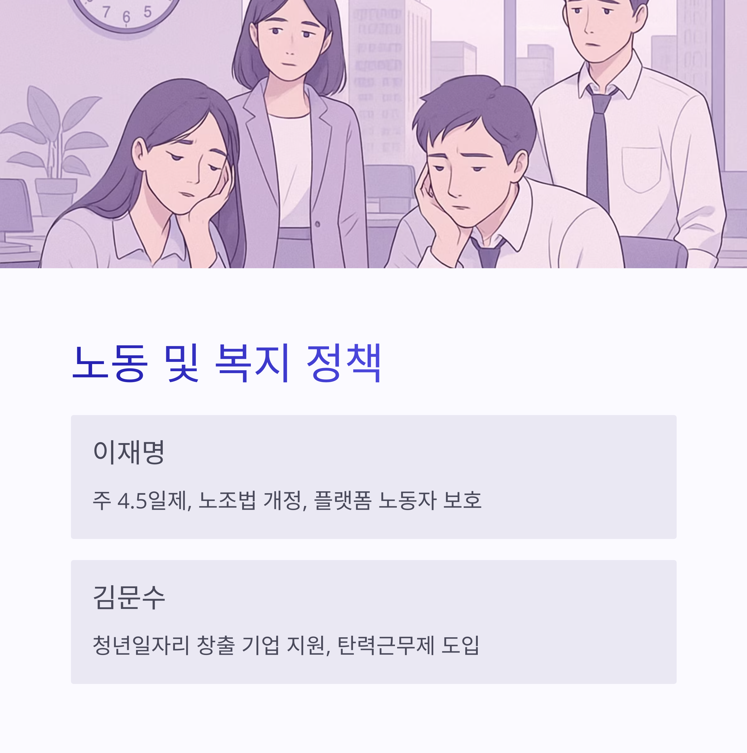 | 이재명 | 주 4.5일제, 노조법 개정, 플랫폼 노동자 보호 |