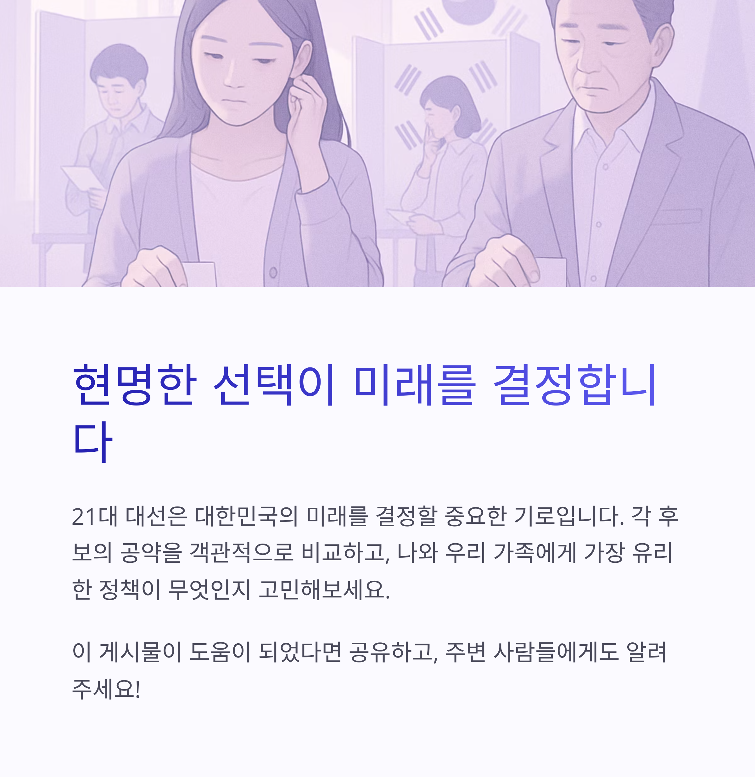 21대 대선은 대한민국의 미래를 결정할 중요한 기로에 놓여 있습니다. 각 대선 후보 공약 객관적으로 비교 분석하고, 나와 우리 가족에게 가장 유리한 정책이 무엇인지 고민해보는 시간이 필요합니다.