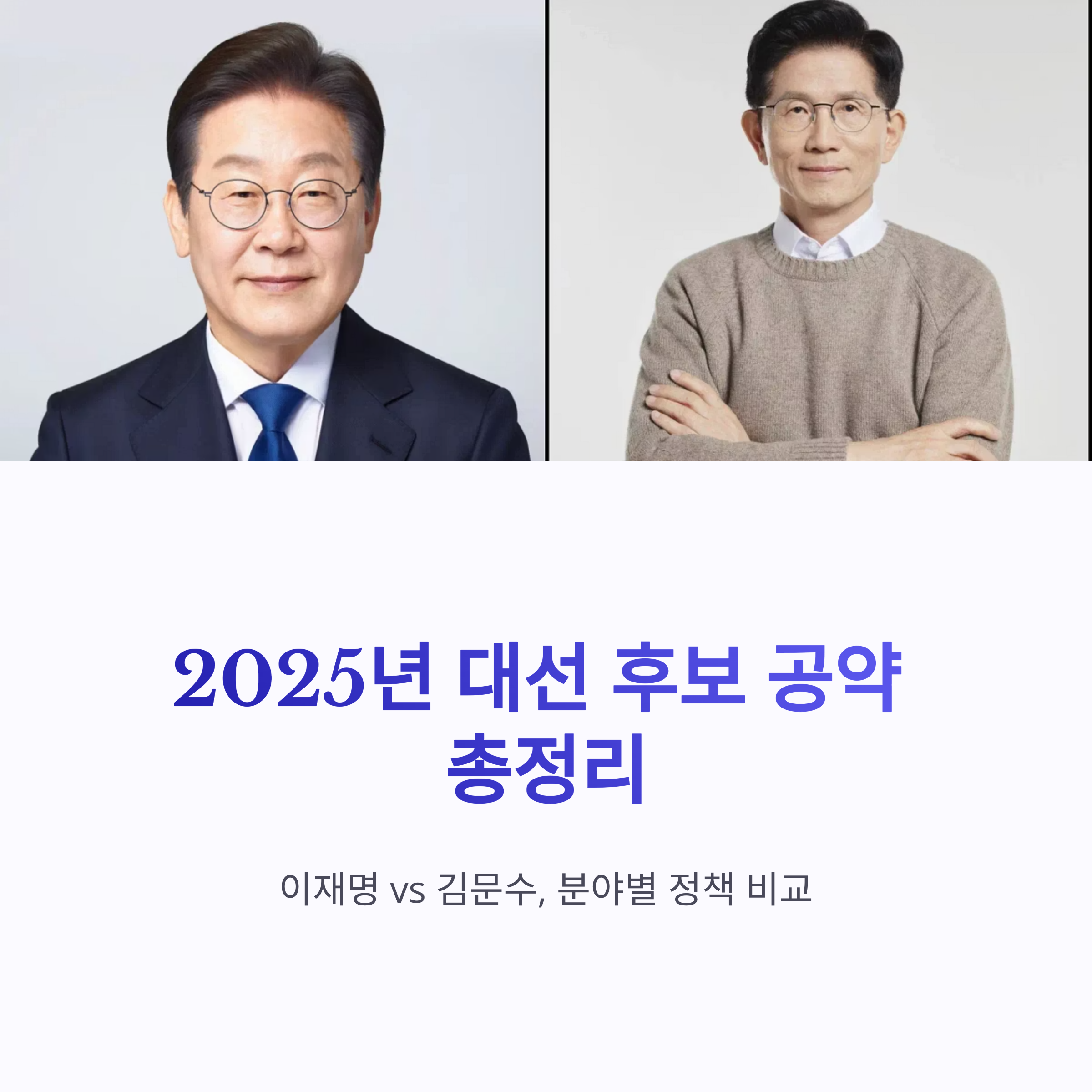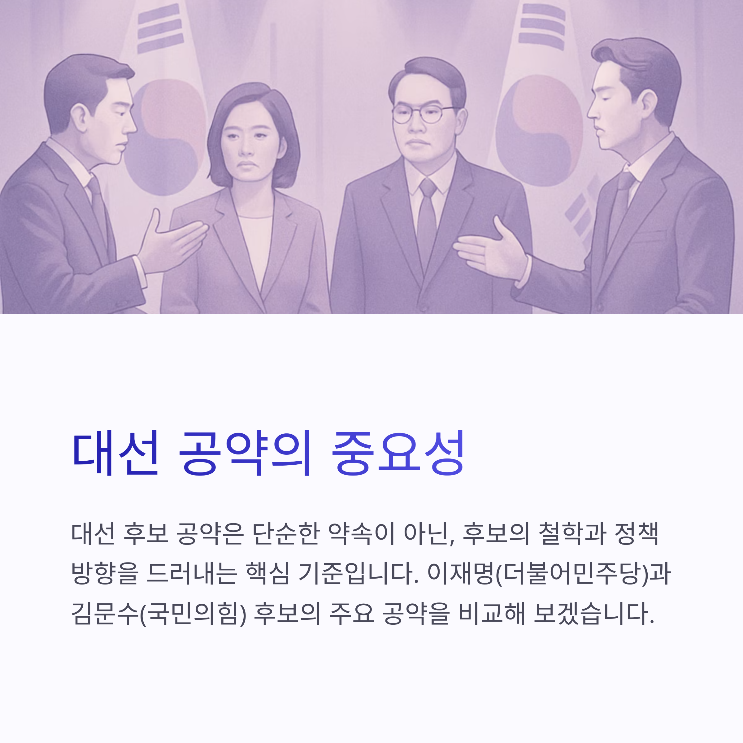 2025년 대한민국 21대 대통령 선거가 다가오면서 유권자들의 관심은 각 후보의 공약에 집중되고 있습니다. 대선 후보 공약은 단순한 약속이 아닌, 후보의 철학과 정책 방향을 드러내는 핵심 기준입니다. 이 글에서는 이재명 후보(더불어민주당)와 김문수 후보(국민의힘)의 주요 공약을 분야별로 정리하고, 그 차이점을 비교 분석해드립니다.