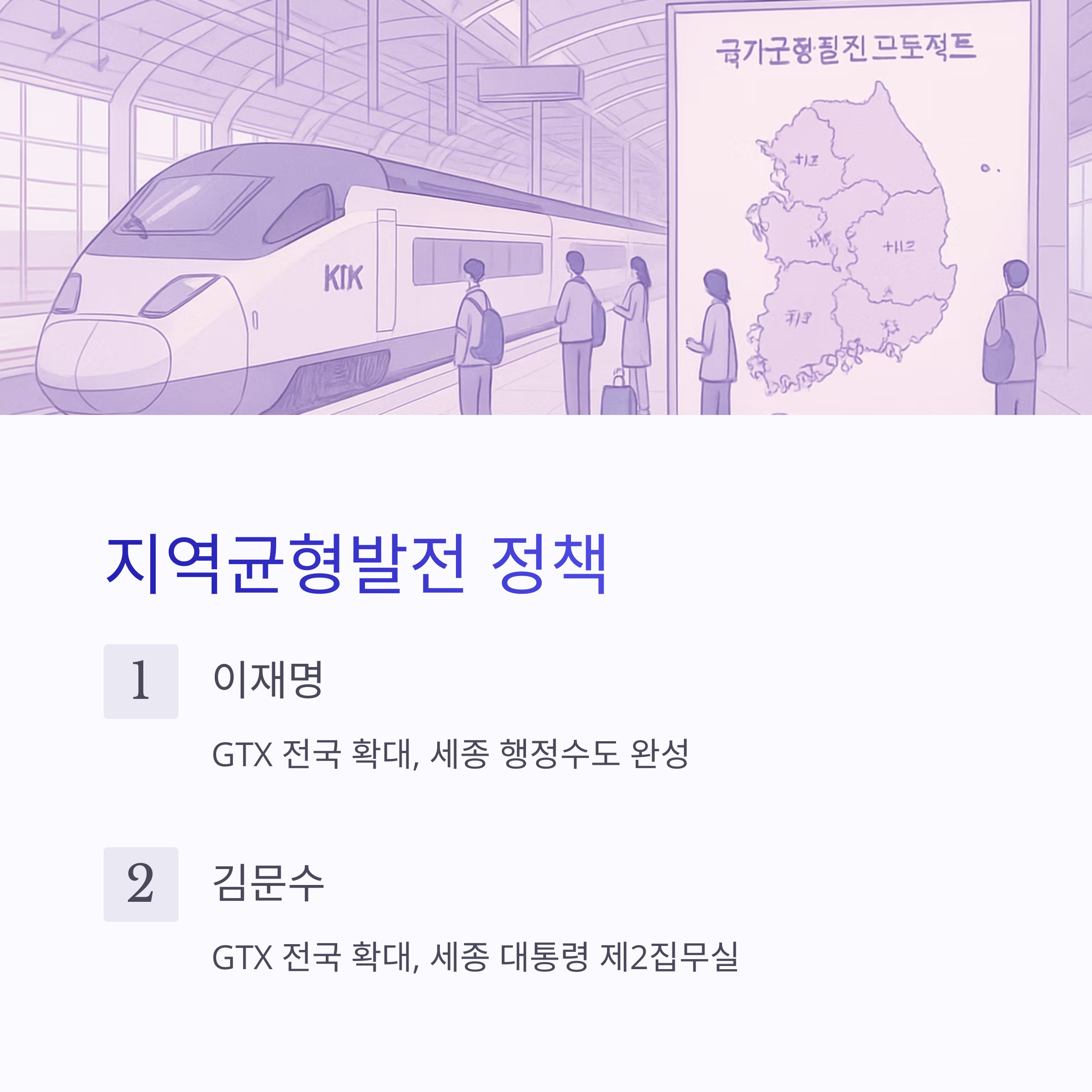 | 지역균형발전 | GTX 전국 확대, 세종 행정수도 완성 | GTX 전국 확대, 세종 대통령 제2집무실 |
