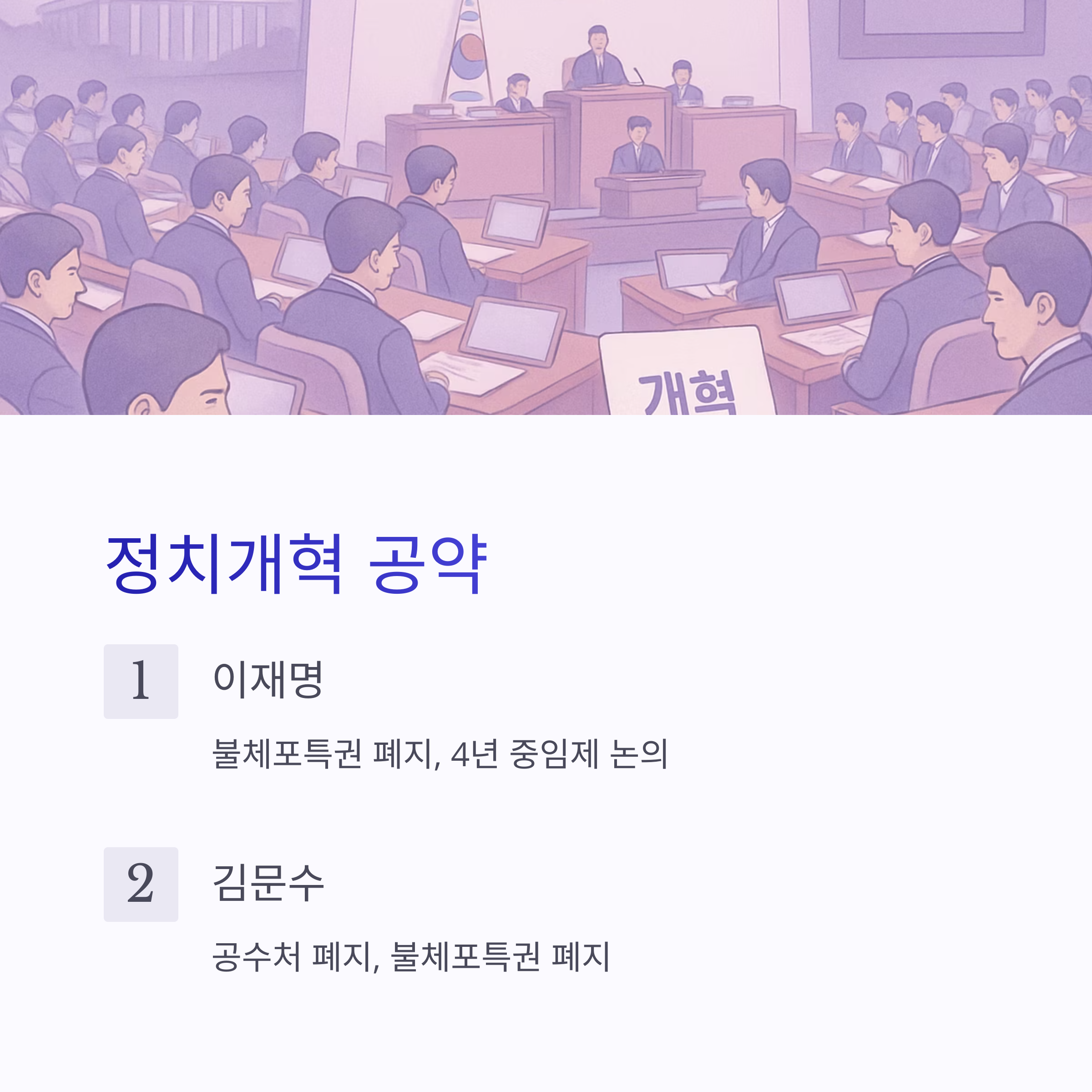 | 정치개혁 | 불체포특권 폐지, 4년 중임제 논의 | 공수처 폐지, 불체포특권 폐지 |