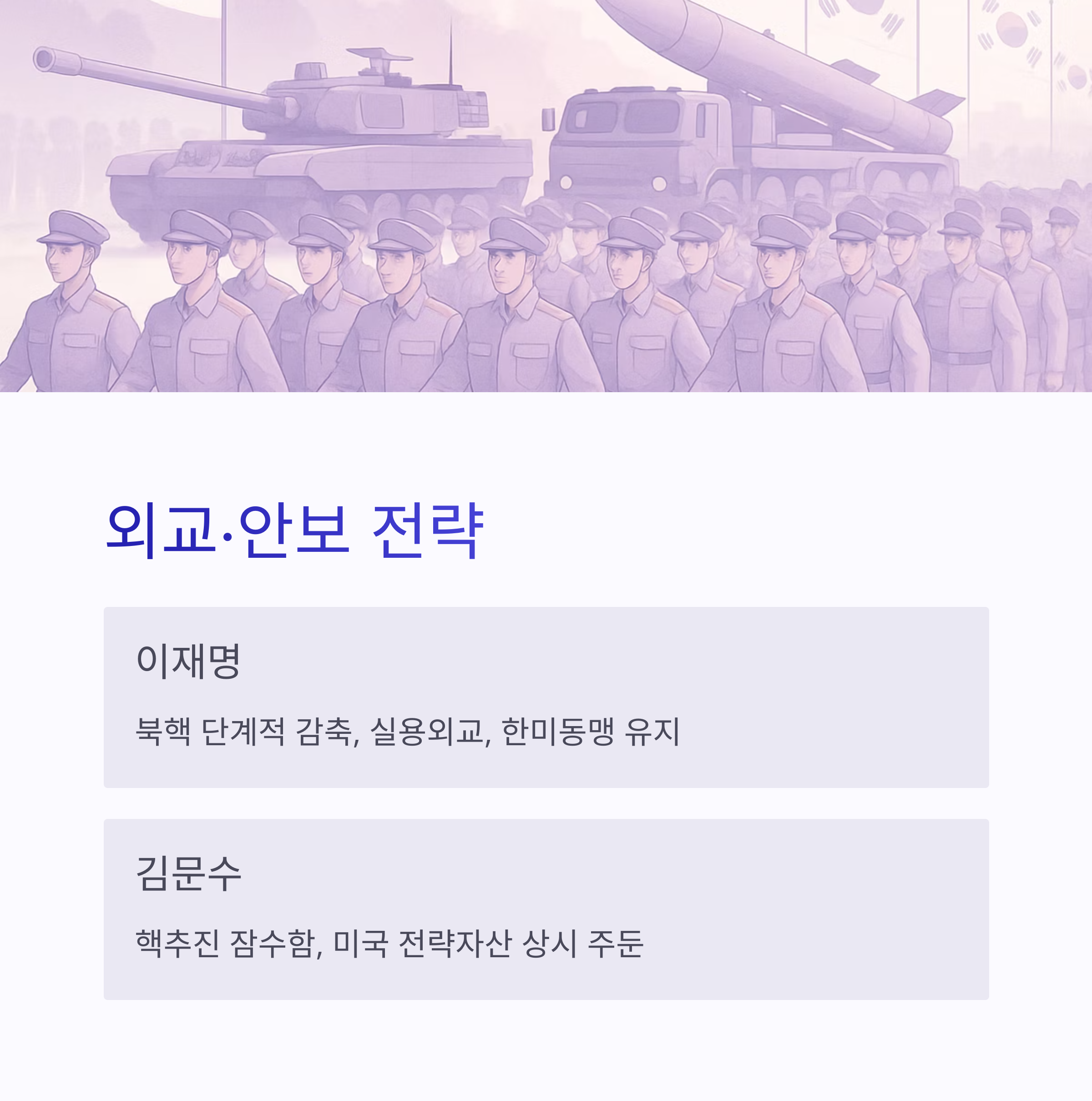 | 이재명 | 북핵 단계적 감축, 실용외교, 한미동맹 유지 |