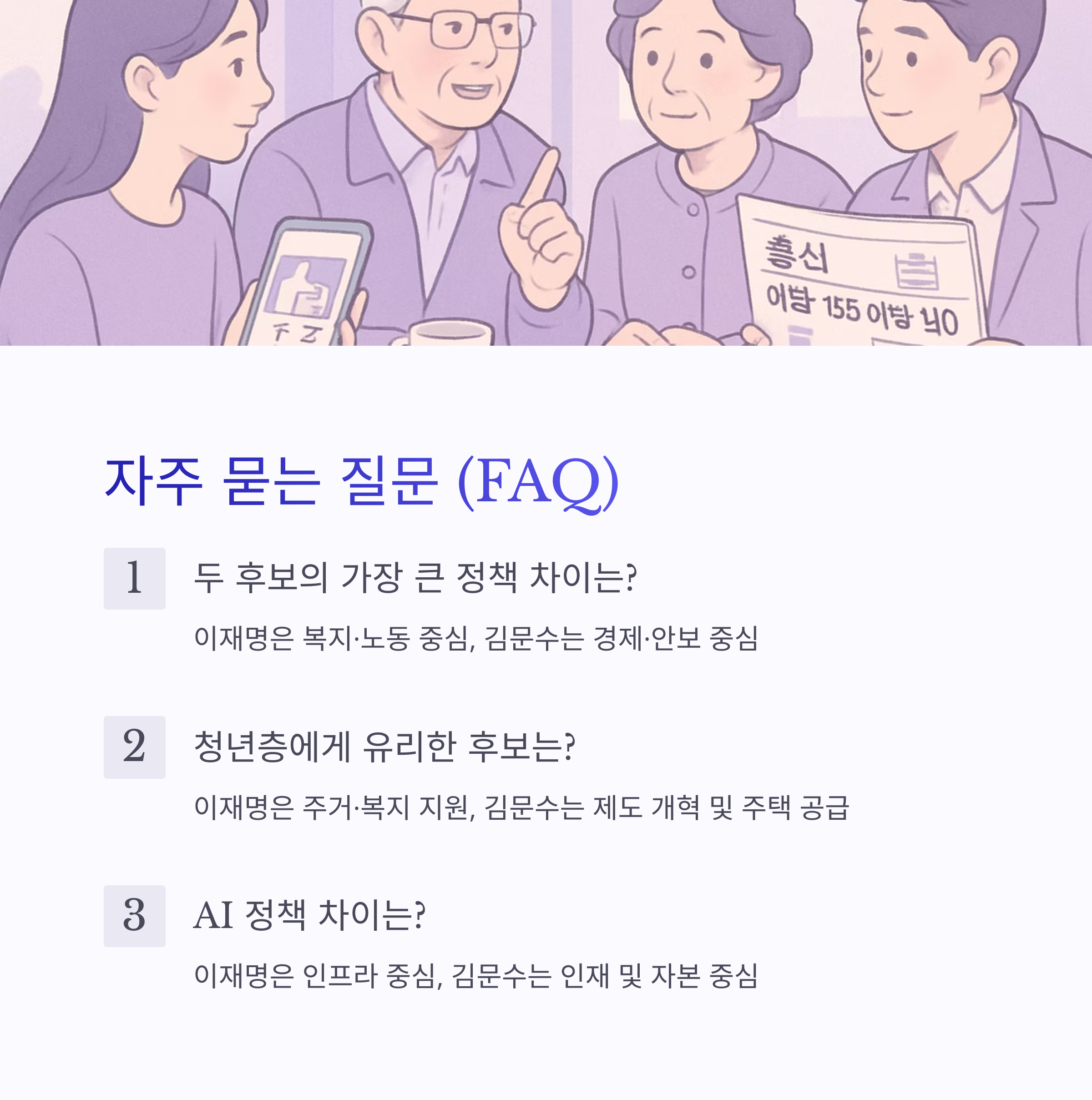 A2. 이재명은 주거·복지 지원 중심, 김문수는 제도 개혁 및 주택 공급 중심입니다.