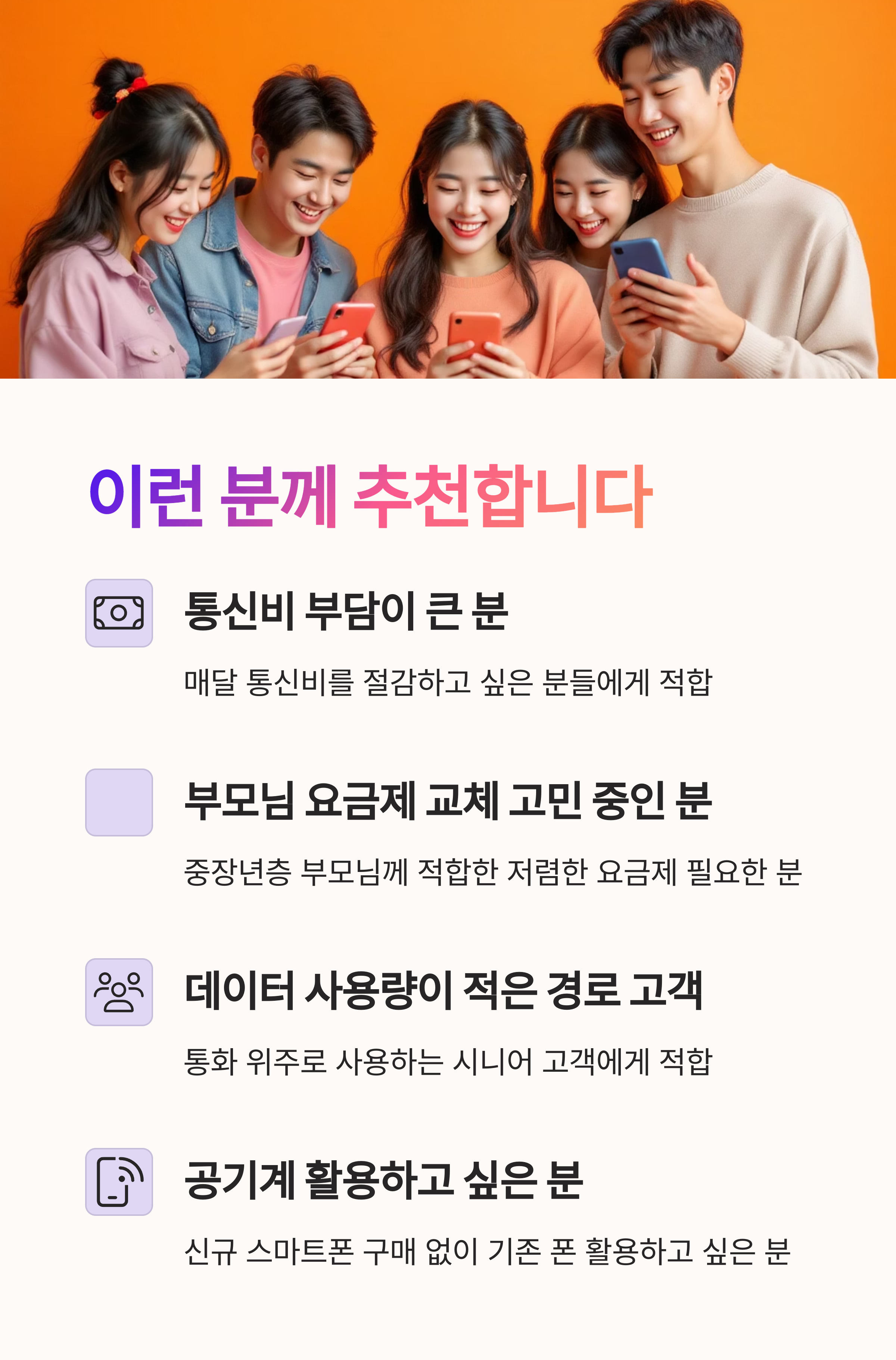 - 특화 요금제: 시니어, 학생, 선불/후불 맞춤