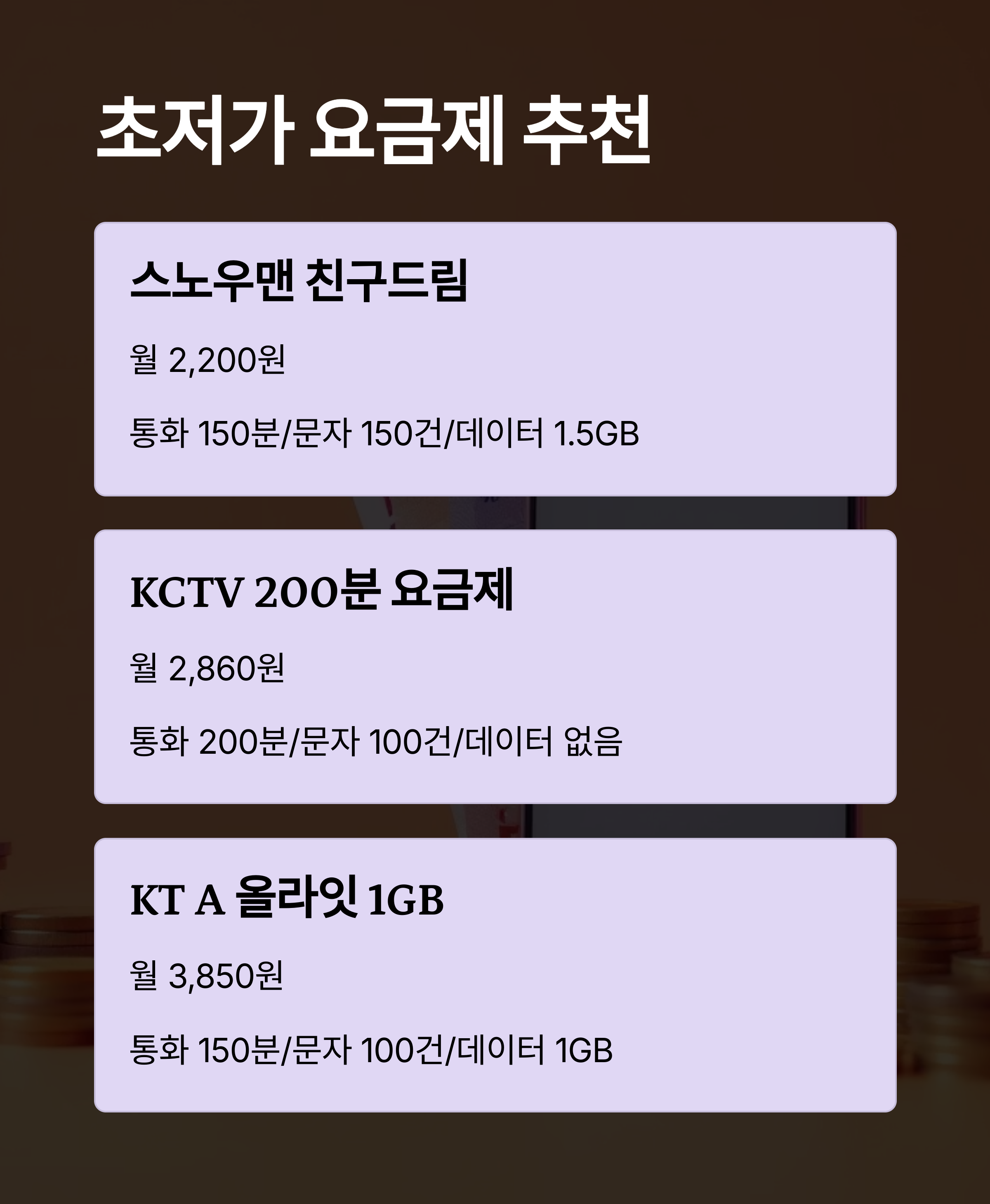 - 초저가 요금제: 2~3천 원대, 가성비 중시