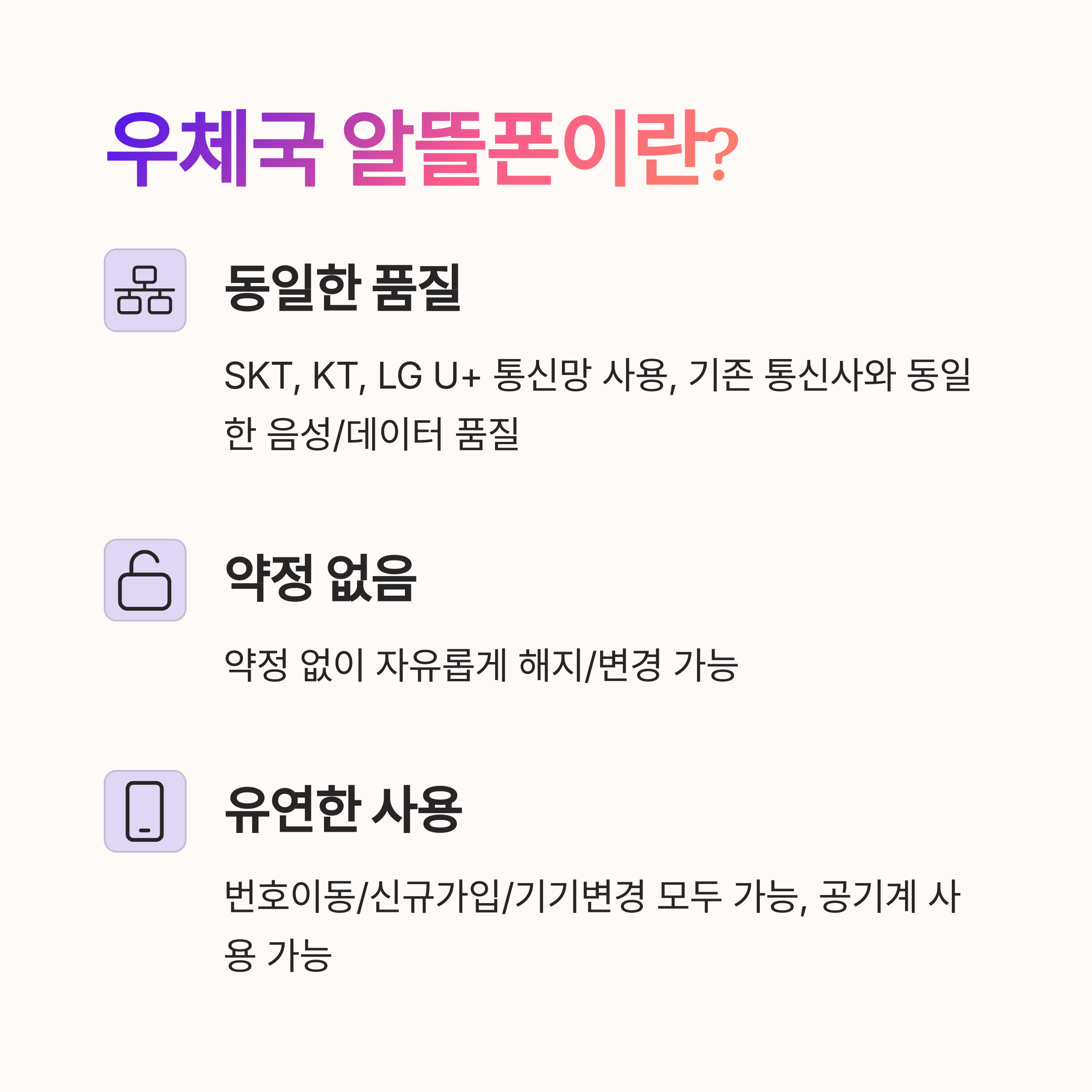 - 기존 통신사와 동일한 음성/데이터 품질
