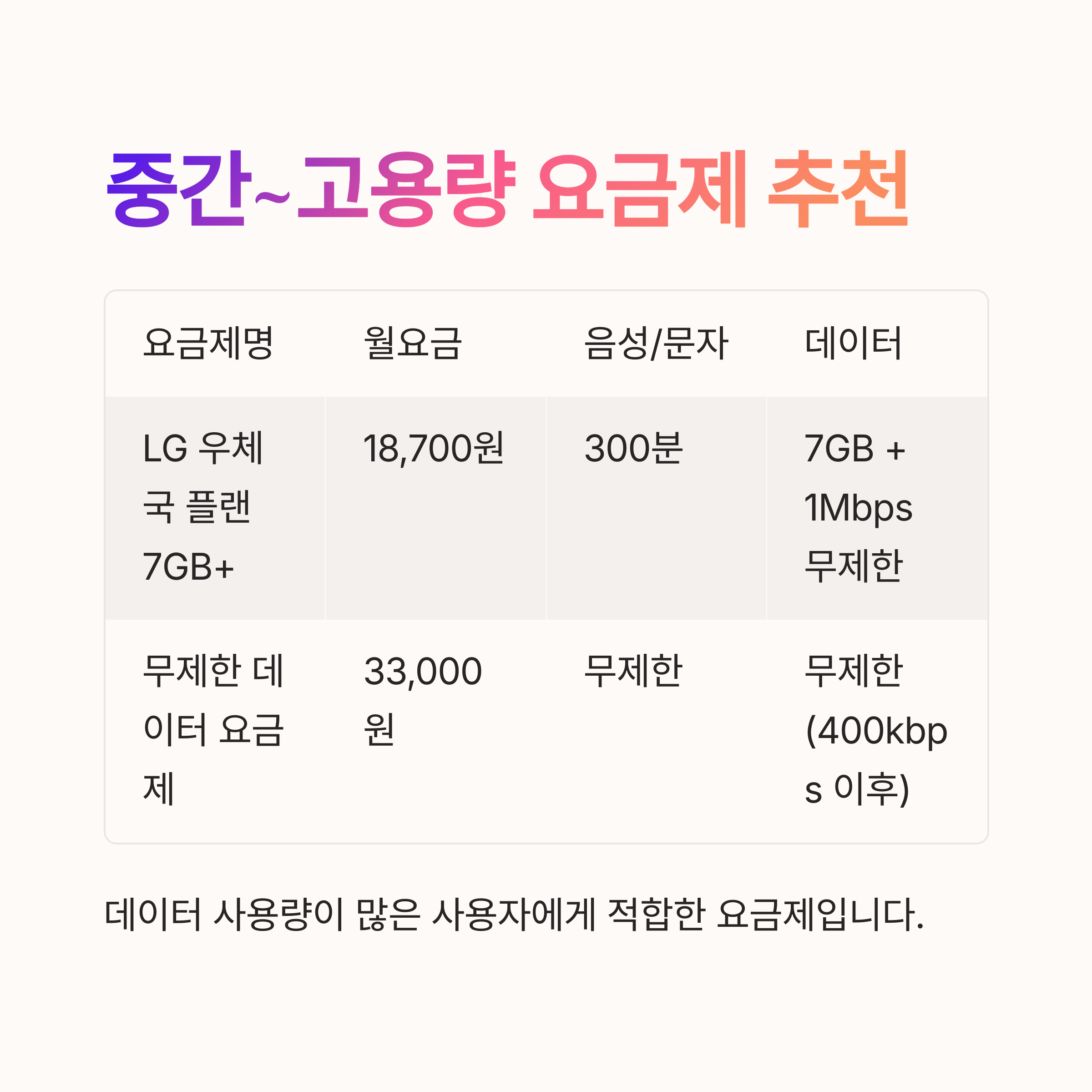 | 무제한 데이터 요금제 | 33,000원 | 무제한 | 400kbps 이후 속도 제한 | 고용량 사용자 |