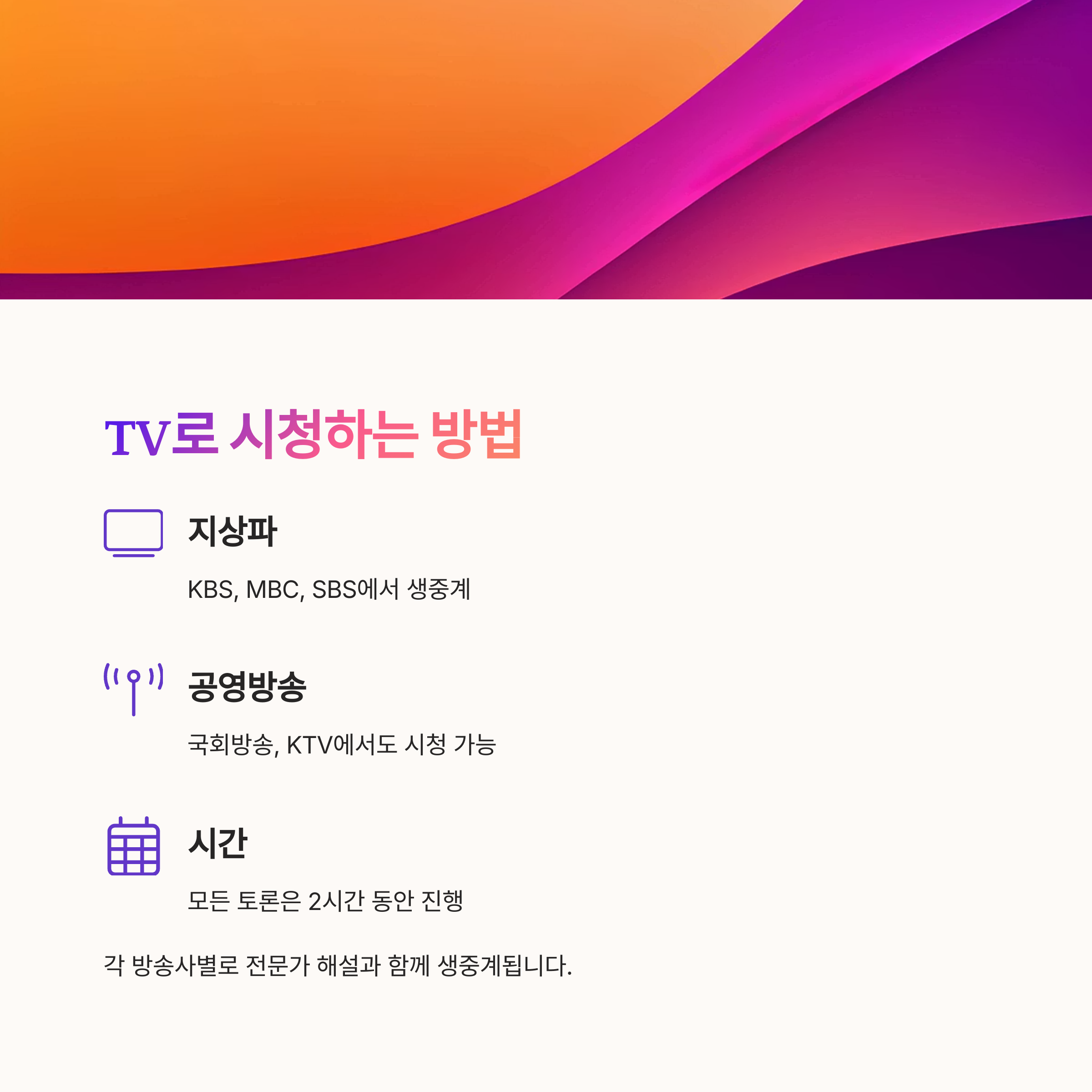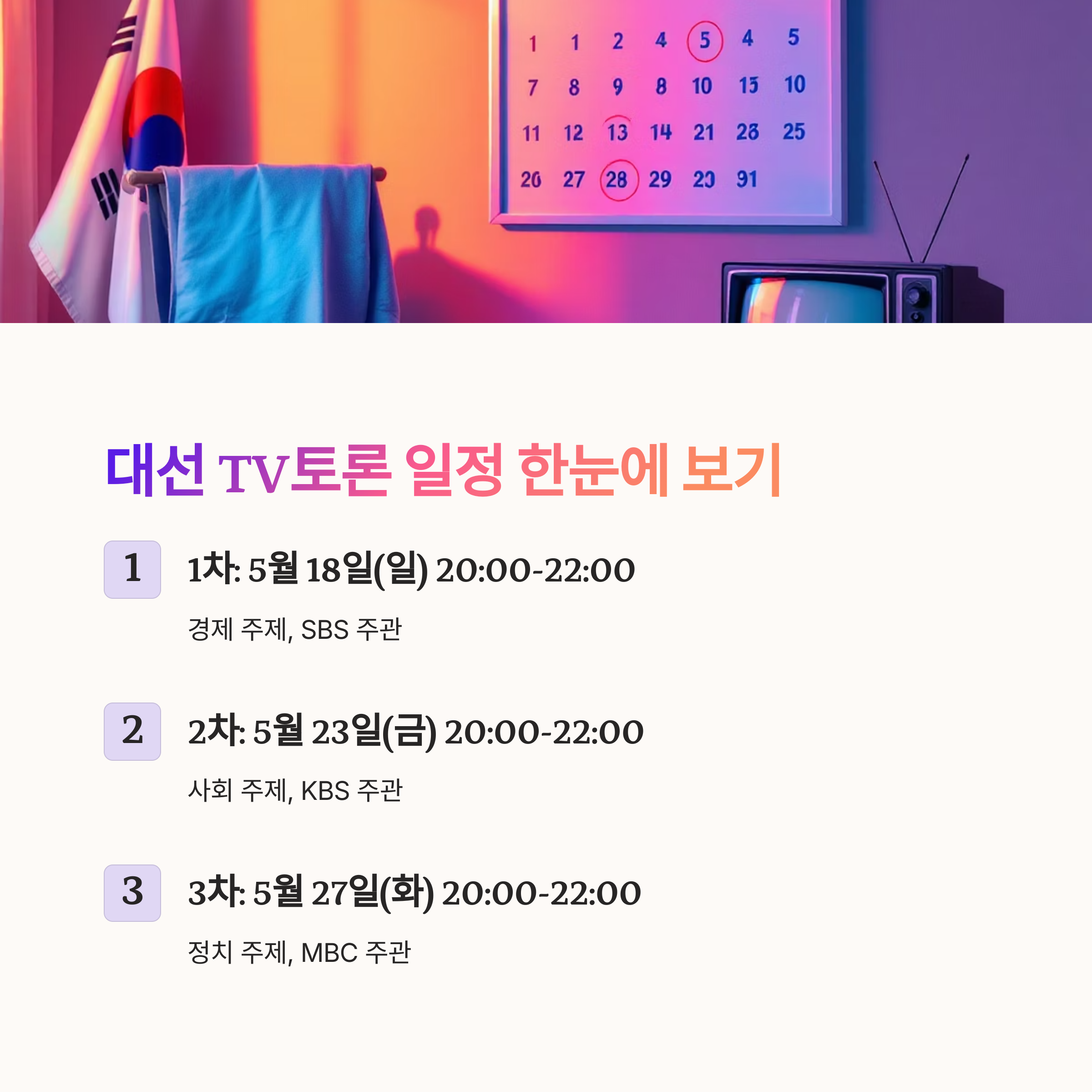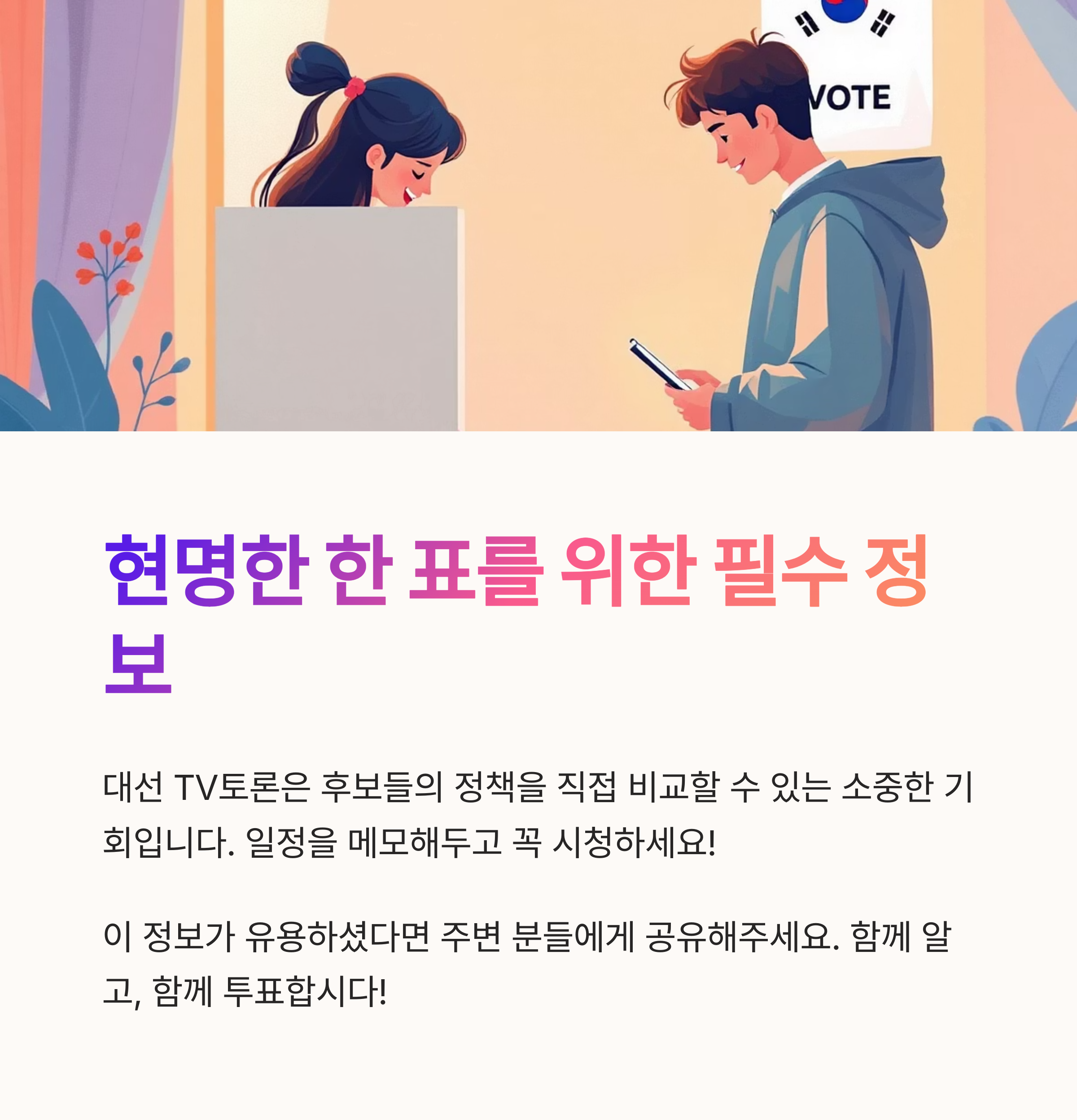 2025년 제21대 대통령 선거를 앞두고 국민의 알 권리를 위한 티비토론회가 열립니다. 후보들의 공약과 정책을 직접 비교할 수 있는 기회인 만큼, 대선 티비토론 일정부터 방송 정보, 참여 자격, 시청 방법까지 한눈에 정리해드립니다.
