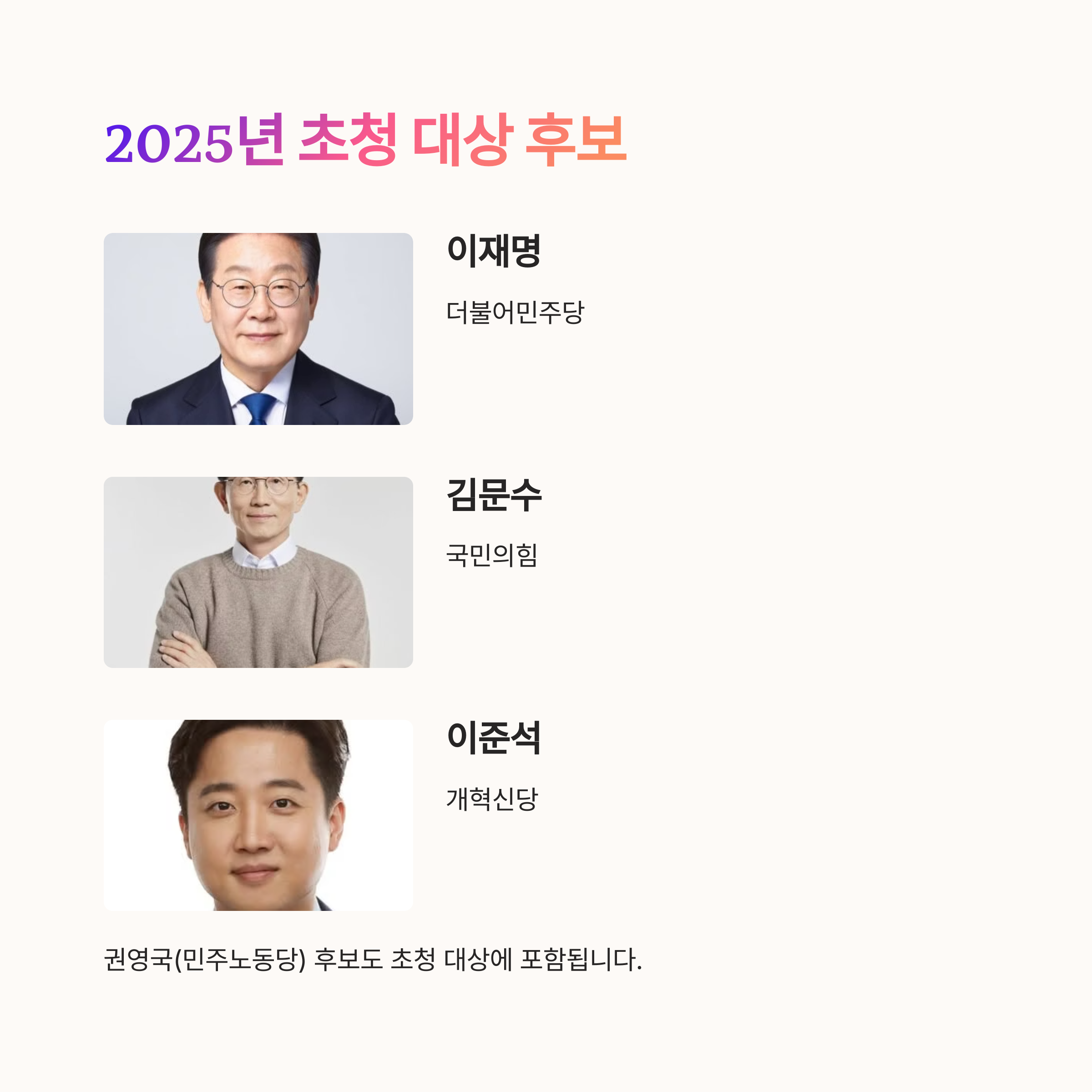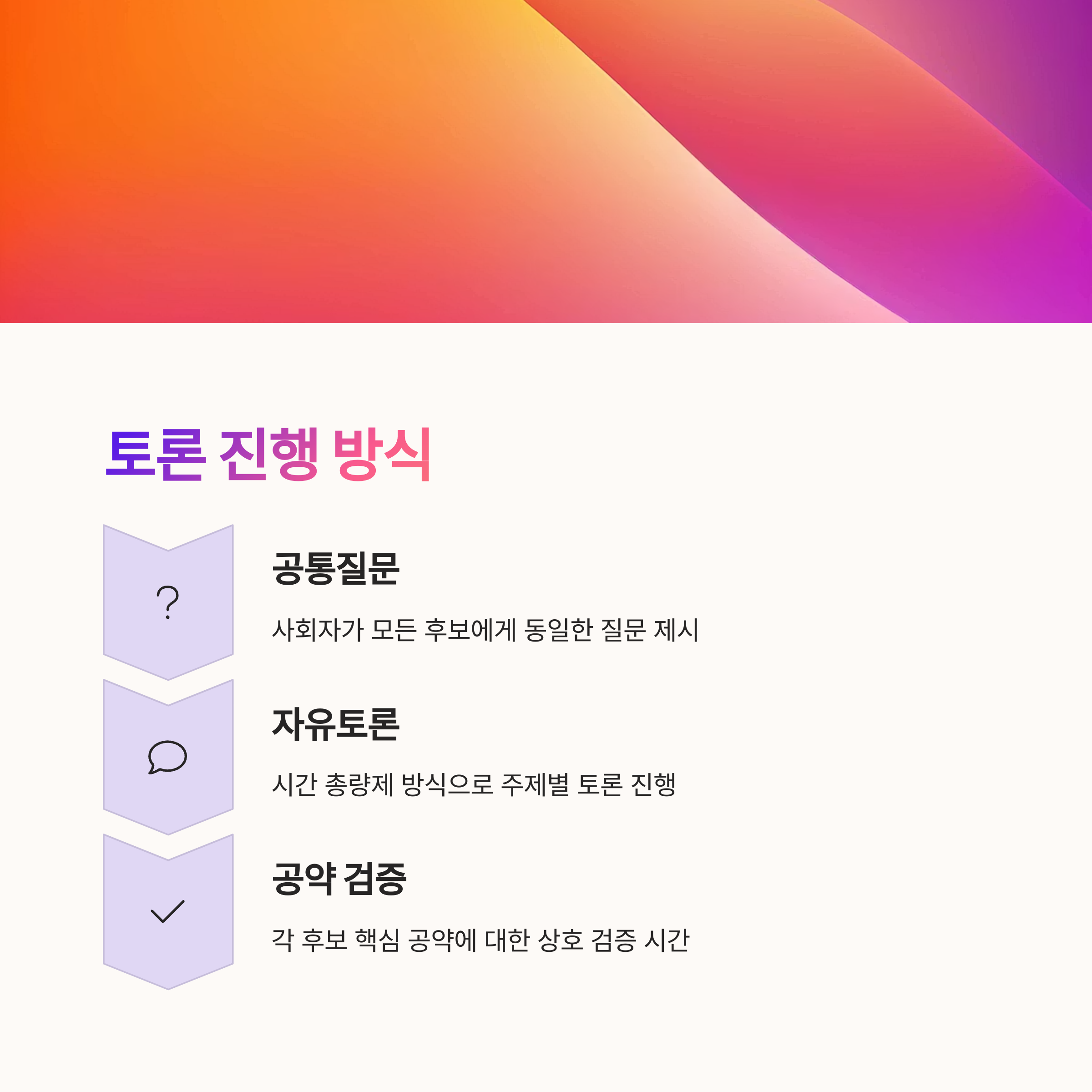 - 공통질문: 사회자가 핵심 이슈에 대해 모든 후보에게 동일한 질문 제시