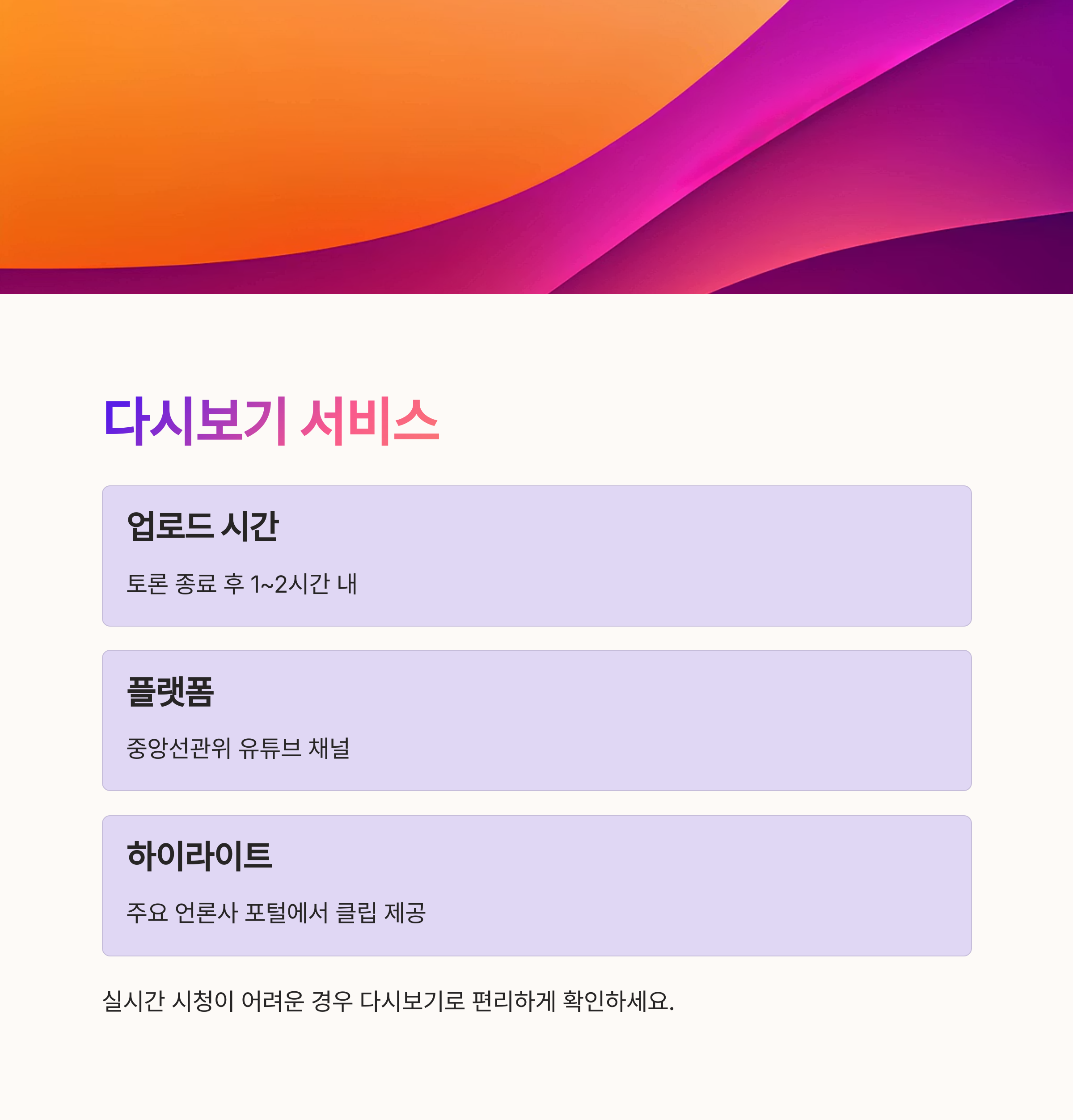 대선 티비토론 일정을 놓친 시청자들을 위해 다시보기 서비스가 제공됩니다. 토론 종료 후 1~2시간 내에 중앙선관위 유튜브 채널에서 전체 토론 영상을 확인할 수 있습니다. 주요 언론사 포털에서도 하이라이트 클립 영상을 제공합니다.