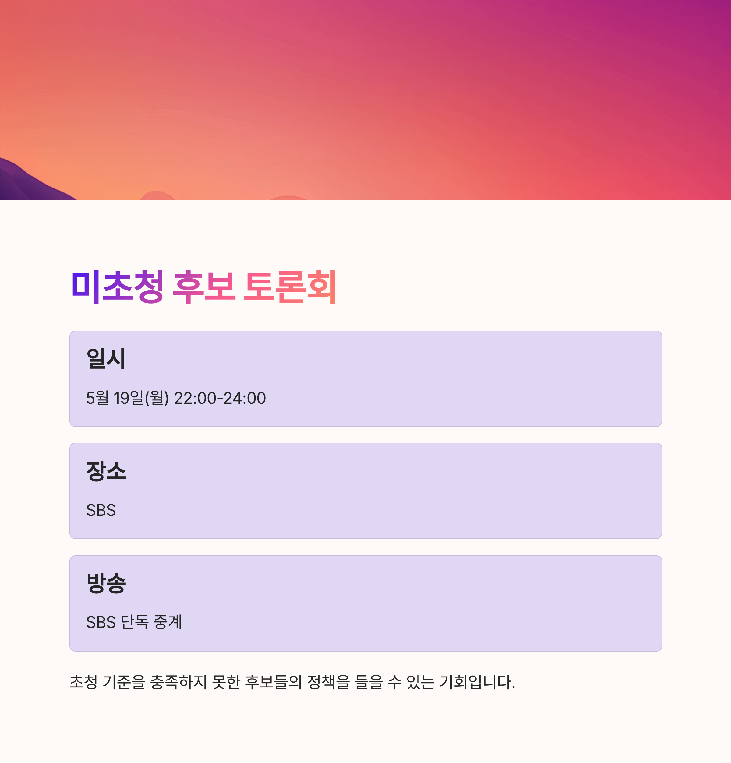 | 미초청 후보 토론 | 5월 19일(월) 22:00~24:00 | 주제 미정 | SBS | SBS 단독 |
