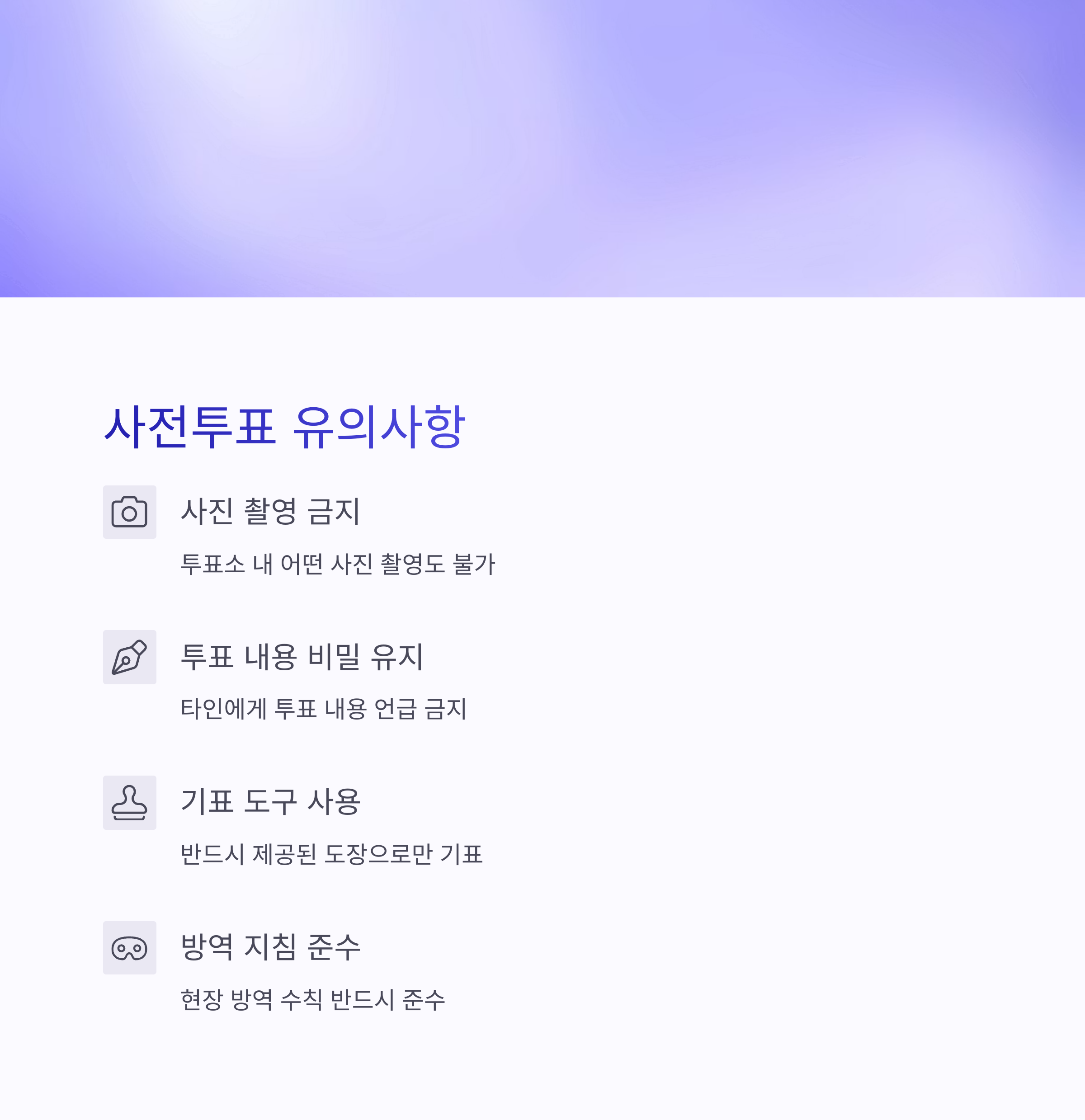 대선 사전투표 장소에서는 선거의 공정성을 위해 몇 가지 지켜야 할 규칙이 있습니다. 이러한 규칙을 어길 경우 투표가 무효가 되거나 법적 문제가 발생할 수 있으니 주의해야 합니다. 모든 유권자가 안전하고 공정하게 투표할 수 있도록 협조해주세요.