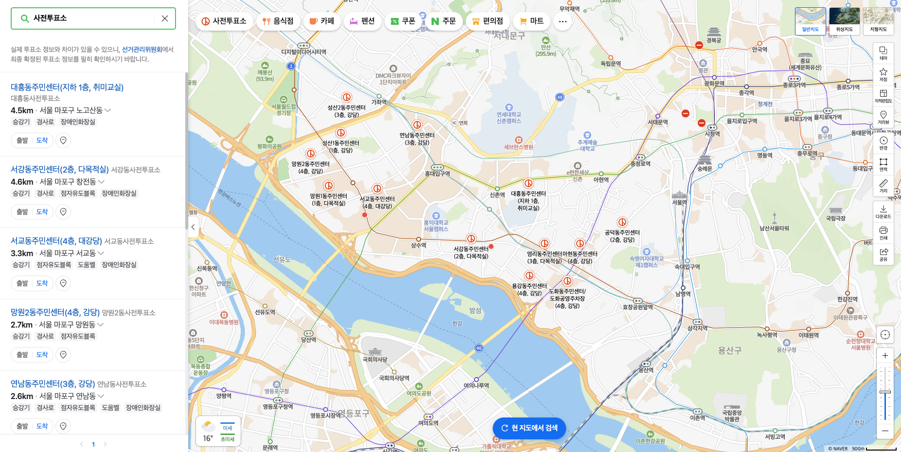 - 네이버 지도 대선 사전투표 장소 검색 기능 이용 ('사전투표소' 검색 > 하단에 현 지도에서 검색 클릭)