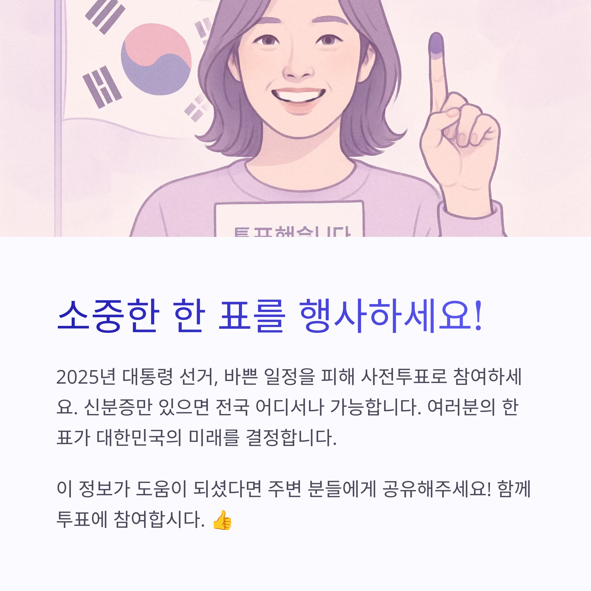 2025년 대통령 선거에서 바쁜 일정을 피해 사전투표로 소중한 한 표를 행사하세요! 신분증만 준비하면 누구나 가능하며, 절차도 간단합니다. 대선 사전투표 장소는 미리 확인해두시고, 투표 당일에는 방역수칙과 유의사항도 꼭 기억하세요. 여러분의 한 표가 대한민국의 미래를 결정하는 소중한 권리임을 잊지 마시기 바랍니다.