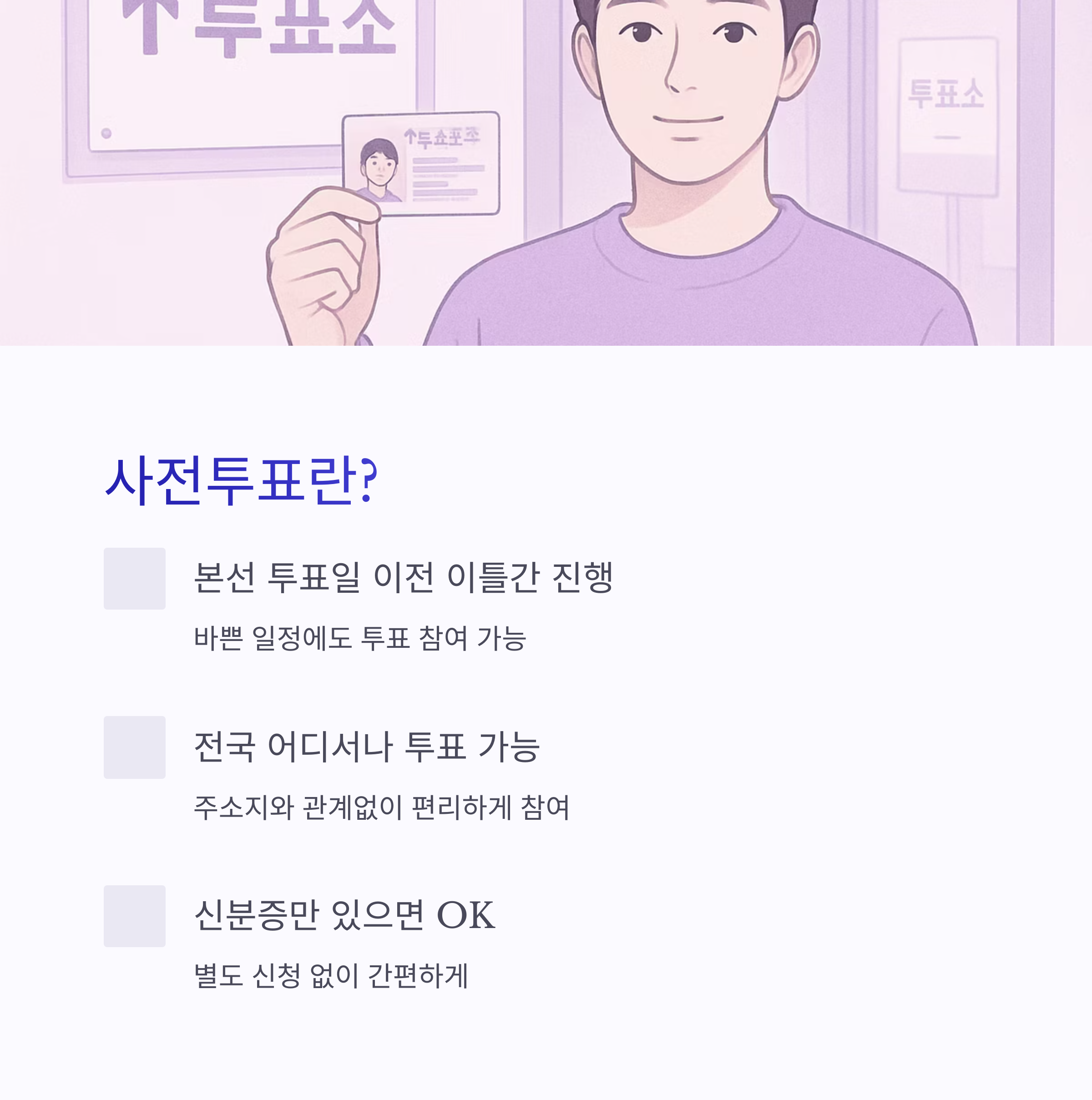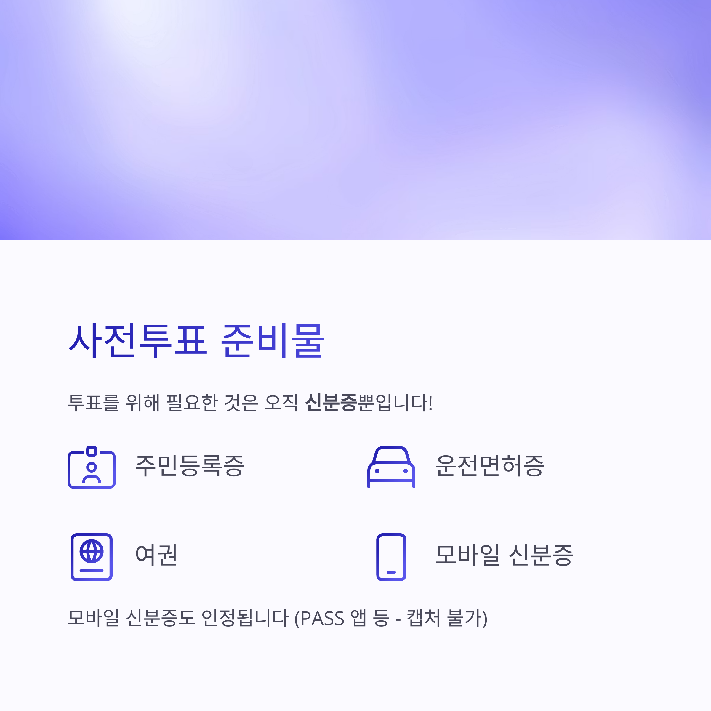 투표를 위해서는 본인 확인이 가능한 신분증만 있으면 됩니다. 별도의 서류나 신청서는 필요하지 않으며, 간단한 준비물만으로도 충분합니다. 모바일 신분증도 인정되므로 실물 신분증이 없어도 걱정하지 마세요.