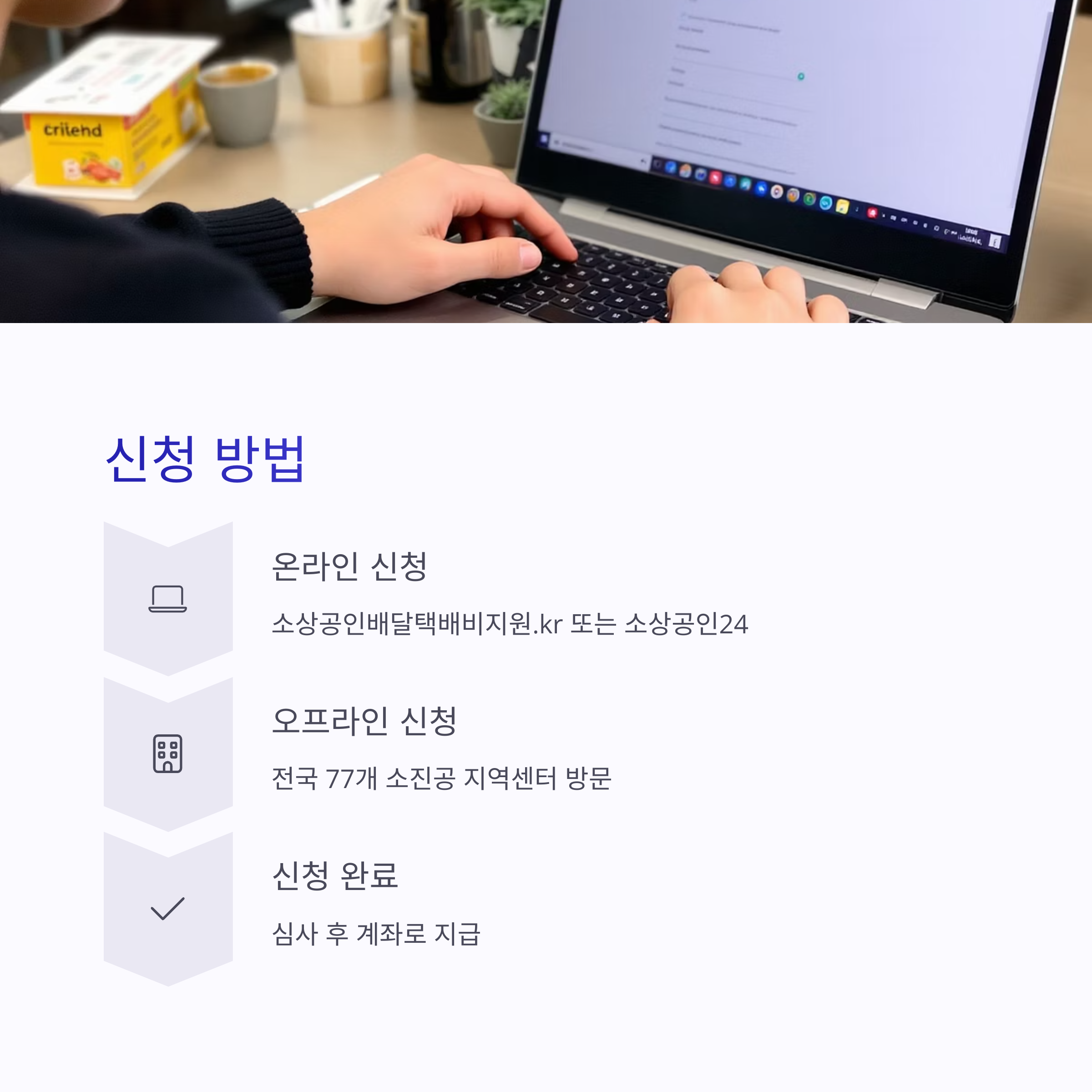 - 온라인: 소상공인배달택배비지원.kr, 소상공인24