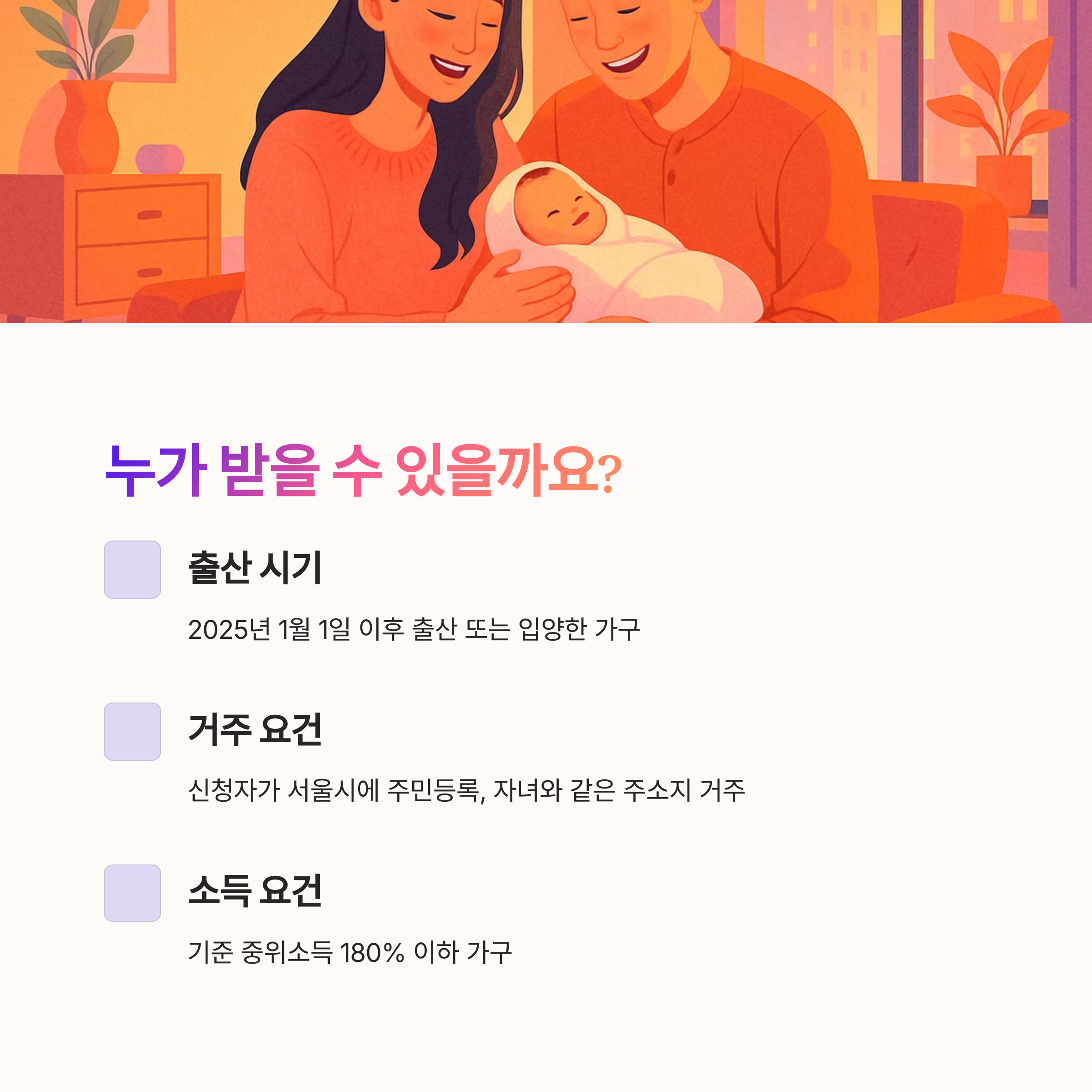 서울시 자녀출산 무주택가구 주거비 지원은 특정 조건을 충족하는 무주택 가구를 대상으로 합니다. 2025년 이후 출산한 가구 중 소득과 주택 요건을 모두 만족해야 지원받을 수 있습니다. 아래 조건들을 꼼꼼히 확인해보세요.