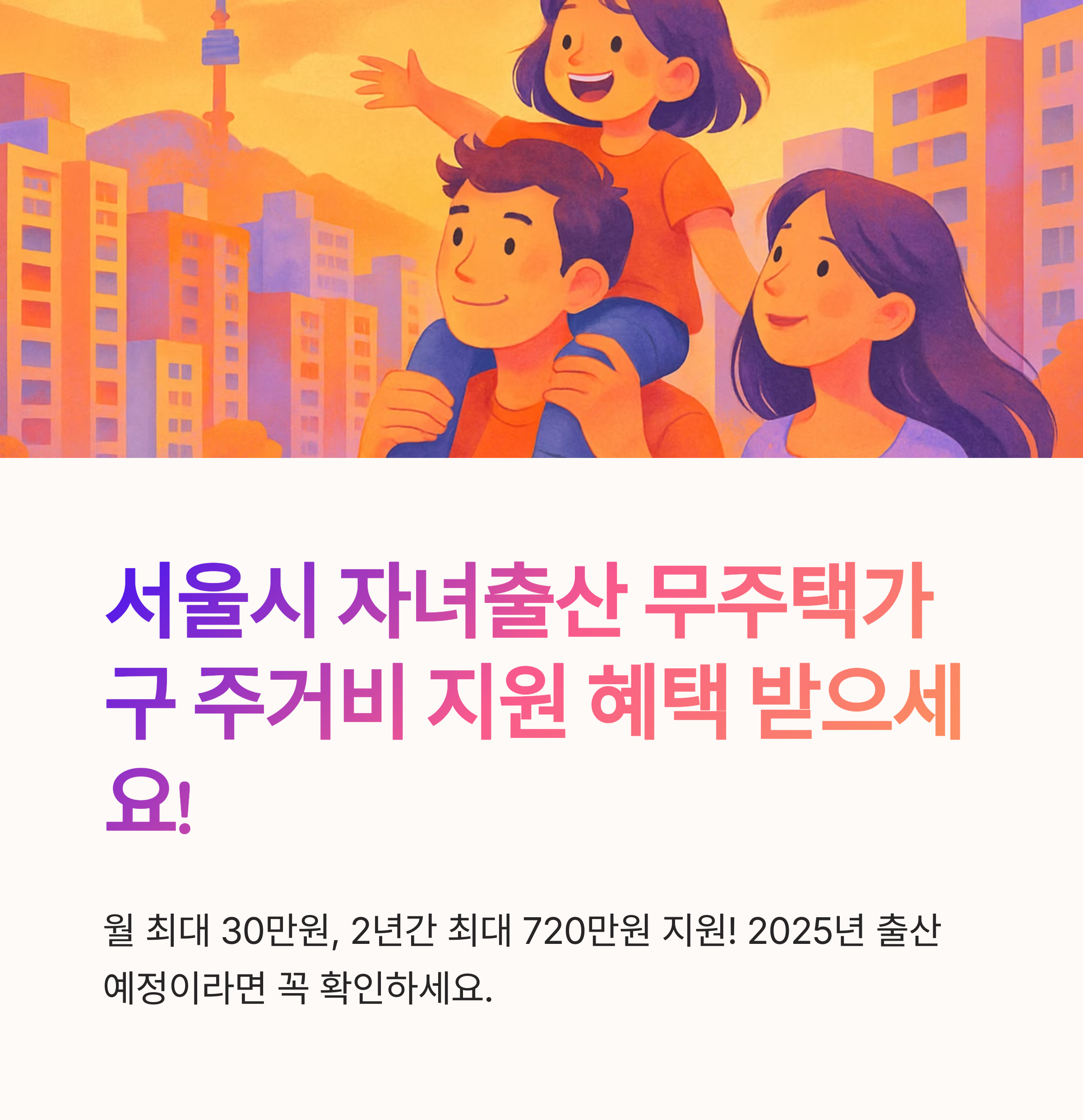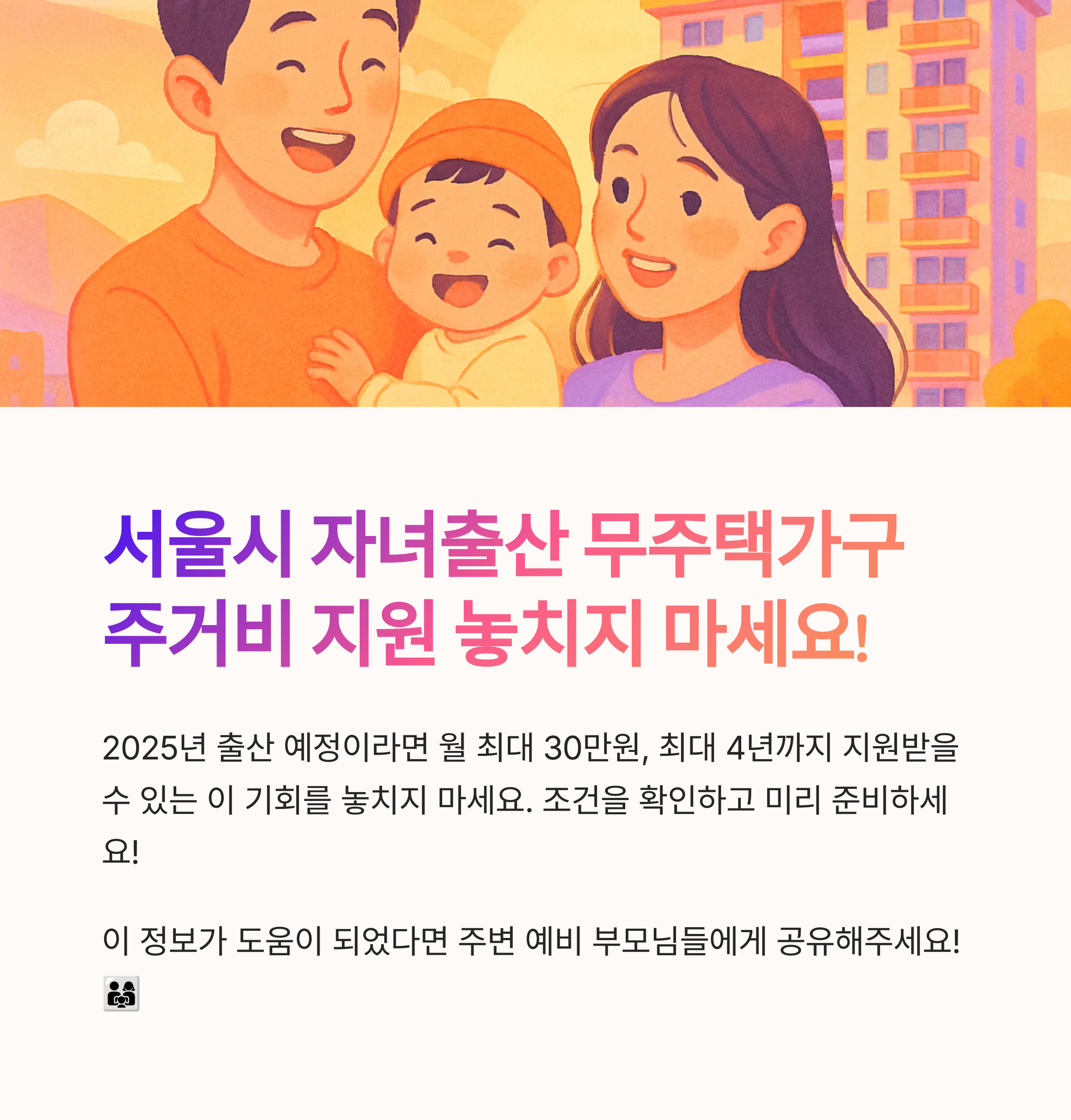 서울시에 거주하며 2025년 이후 자녀를 출산하거나 입양한 무주택 가구라면 주목해야 할 정책이 있습니다. 바로 서울시 자녀출산 무주택가구 주거비 지원사업인데요. 월 최대 30만 원, 2년간 최대 720만 원의 주거비를 지원받을 수 있어 많은 분들의 관심이 집중되고 있습니다.