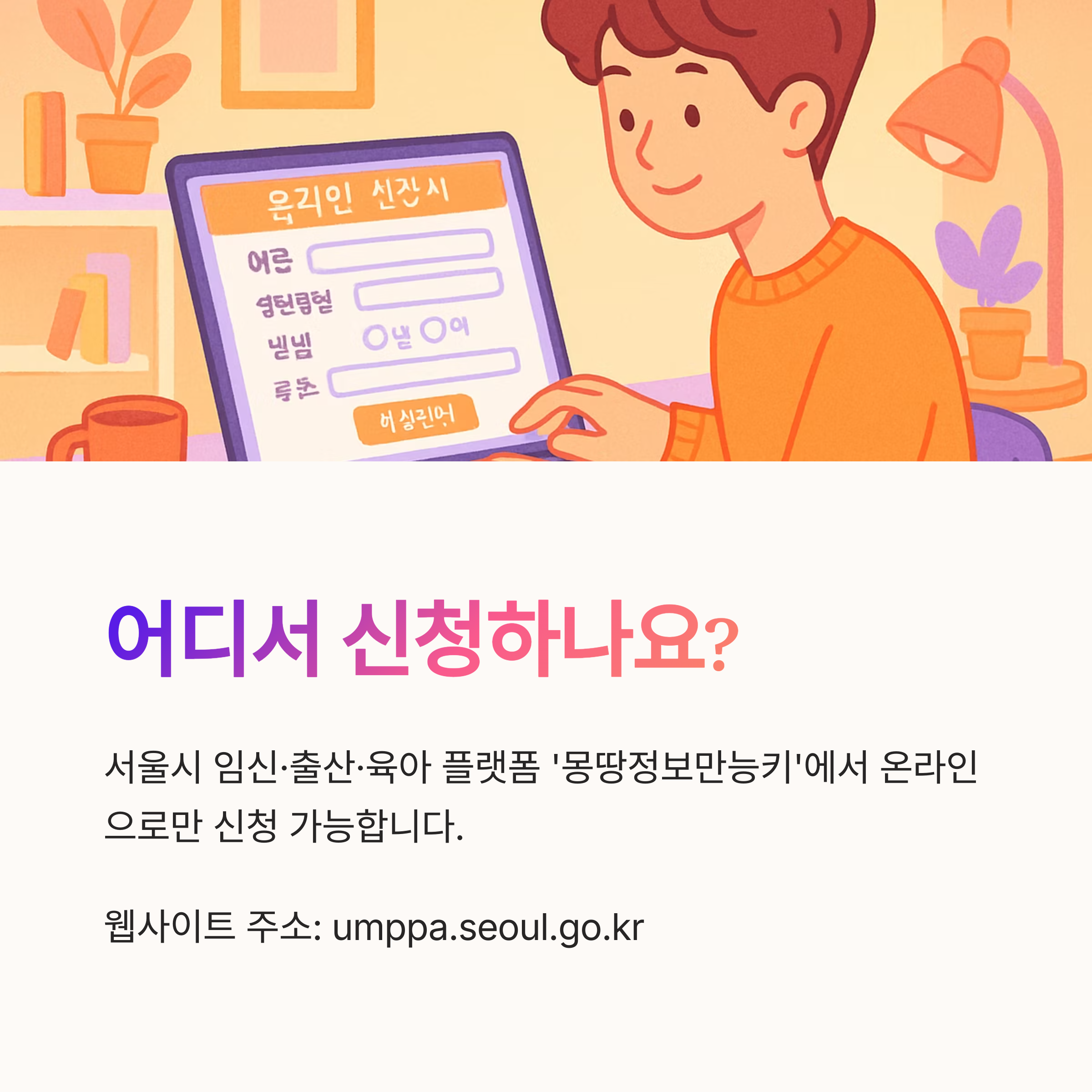 신청방법: 서울시 임신‧출산‧육아 플랫폼 '몽땅정보만능키'(umppa.seoul.go.kr)에서 온라인 신청