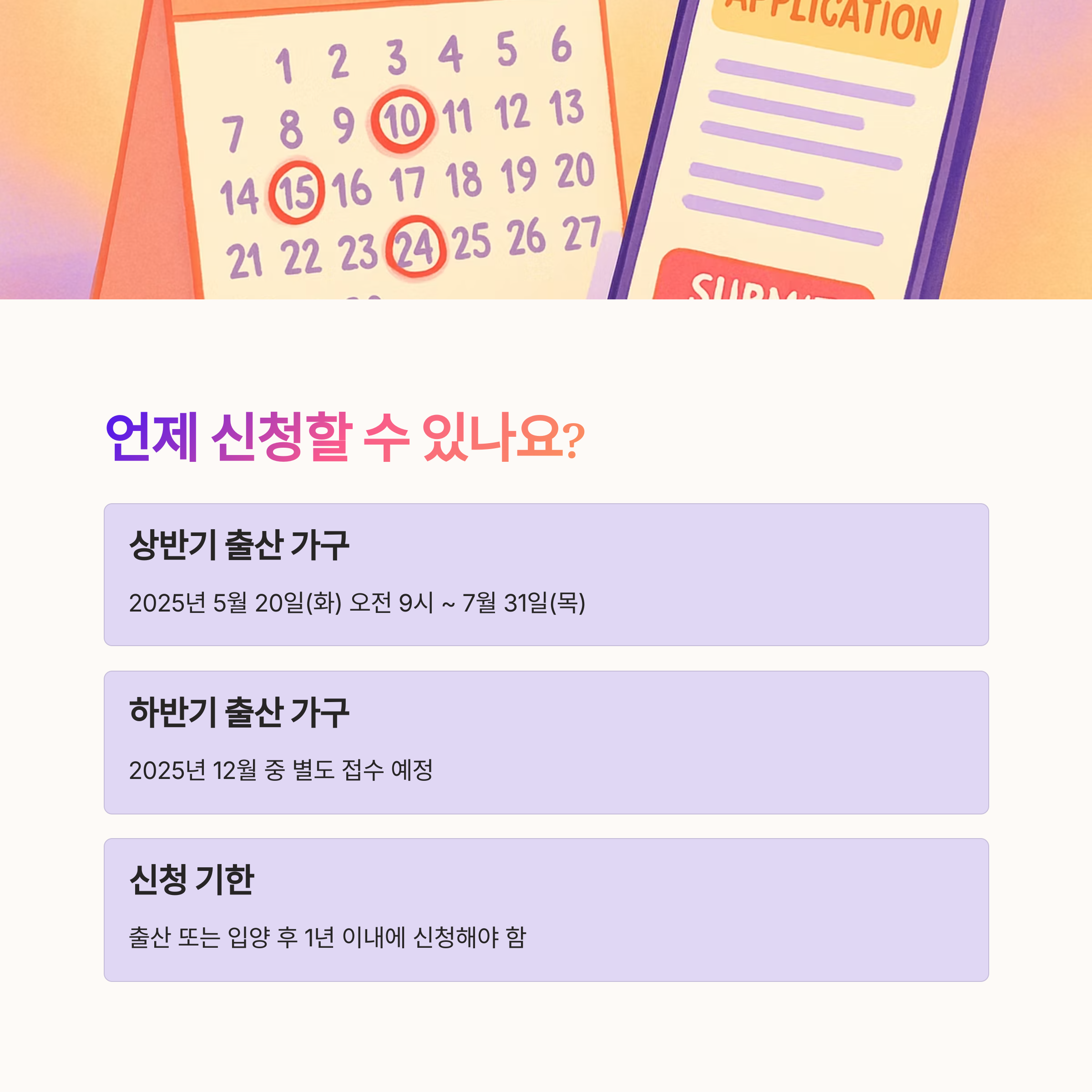 상반기 출산 가구 신청기간: 2025년 5월 20일(화) 오전 9시 ~ 7월 31일(목)