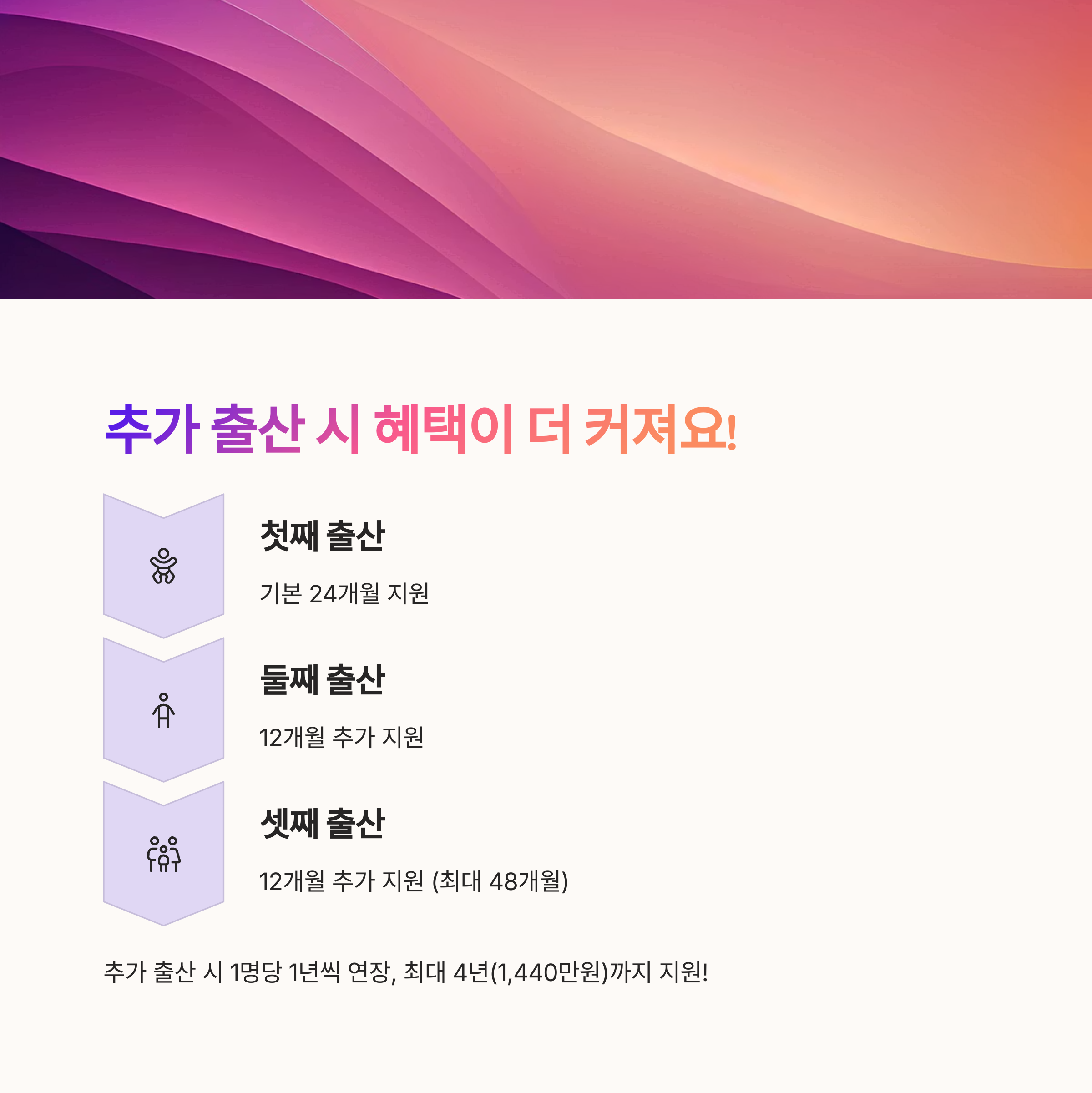 지원기간: 기본 24개월, 추가 출산 시 1명당 1년 연장 (최대 4년, 총 1,440만 원)