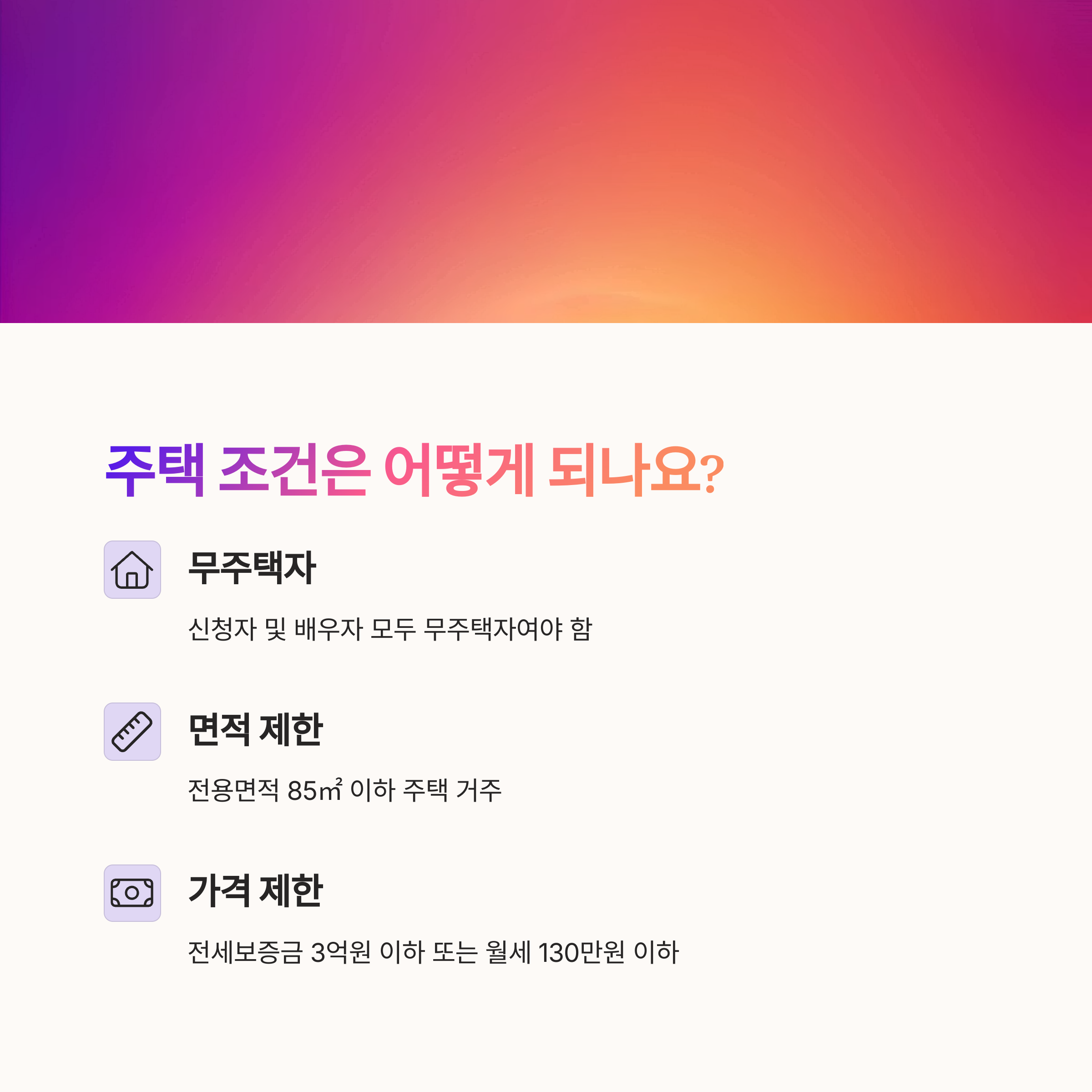 - 전세보증금 3억 원 이하 또는 월세 130만 원 이하(환산 포함)
