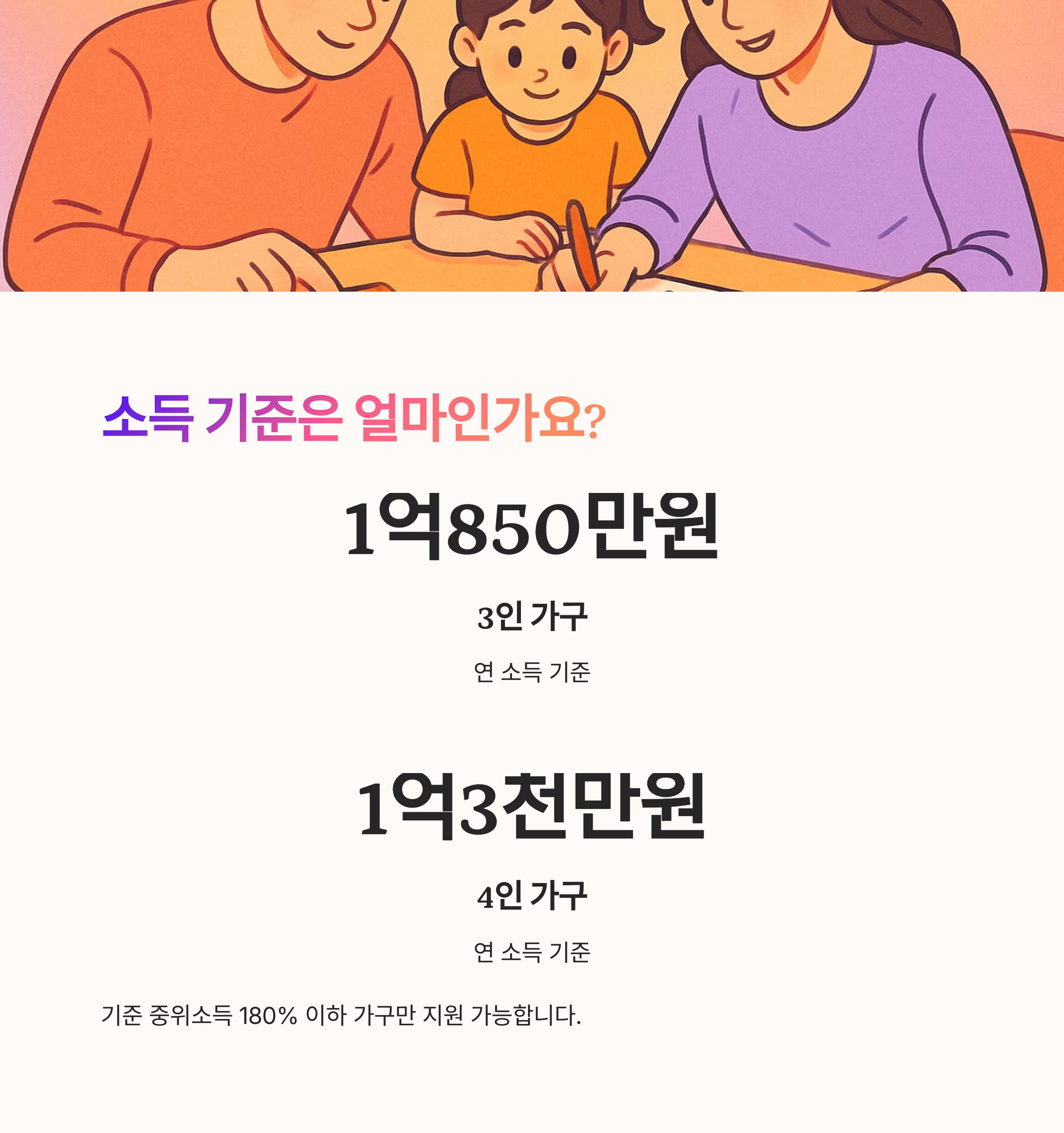 소득 요건: 기준 중위소득 180% 이하 (예: 3인 가구 연 1억 850만 원 이하, 4인 가구 연 1억 3천만 원 이하)