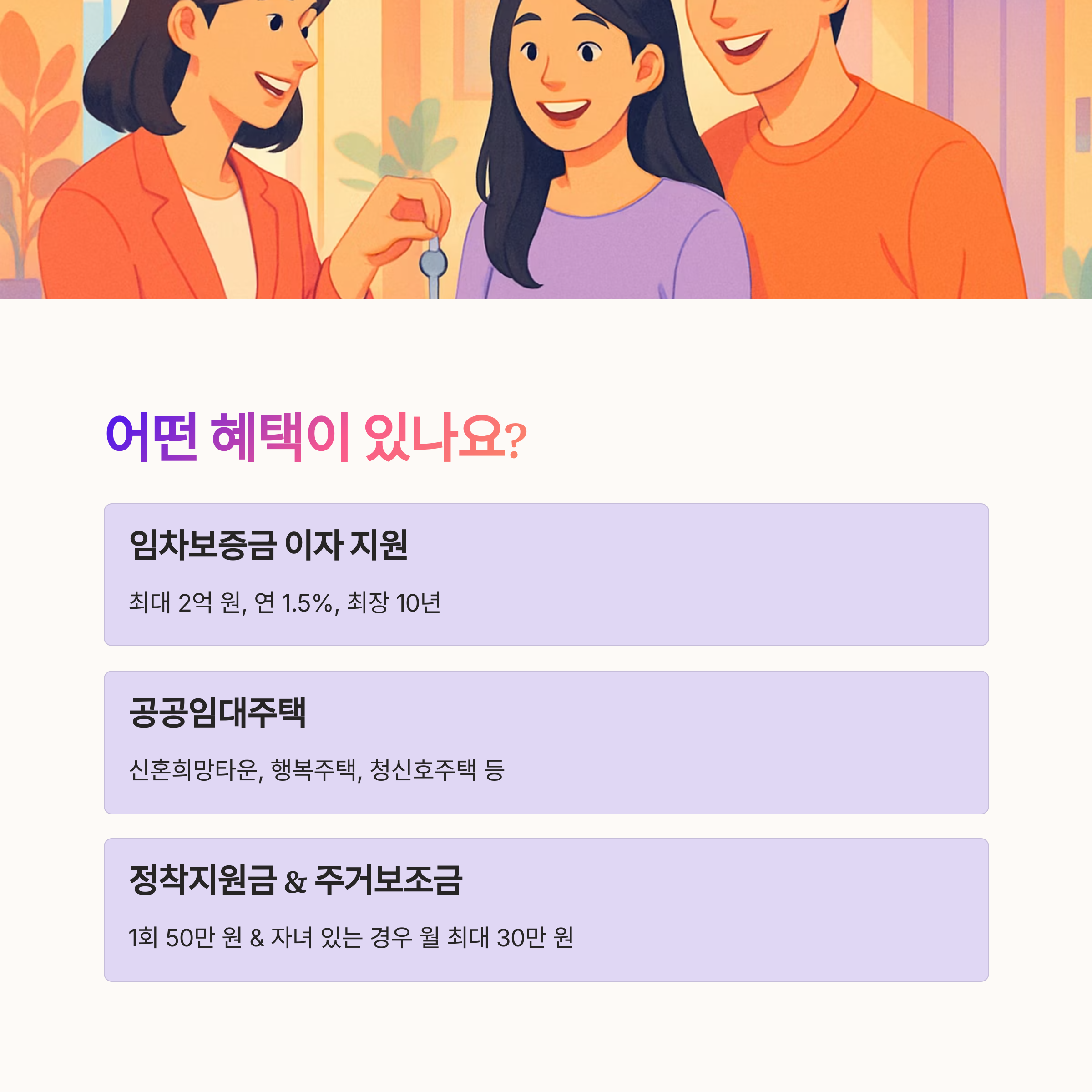 - 임차보증금 이자 지원 (최대 2억 원, 연 1.5%, 최장 10년)