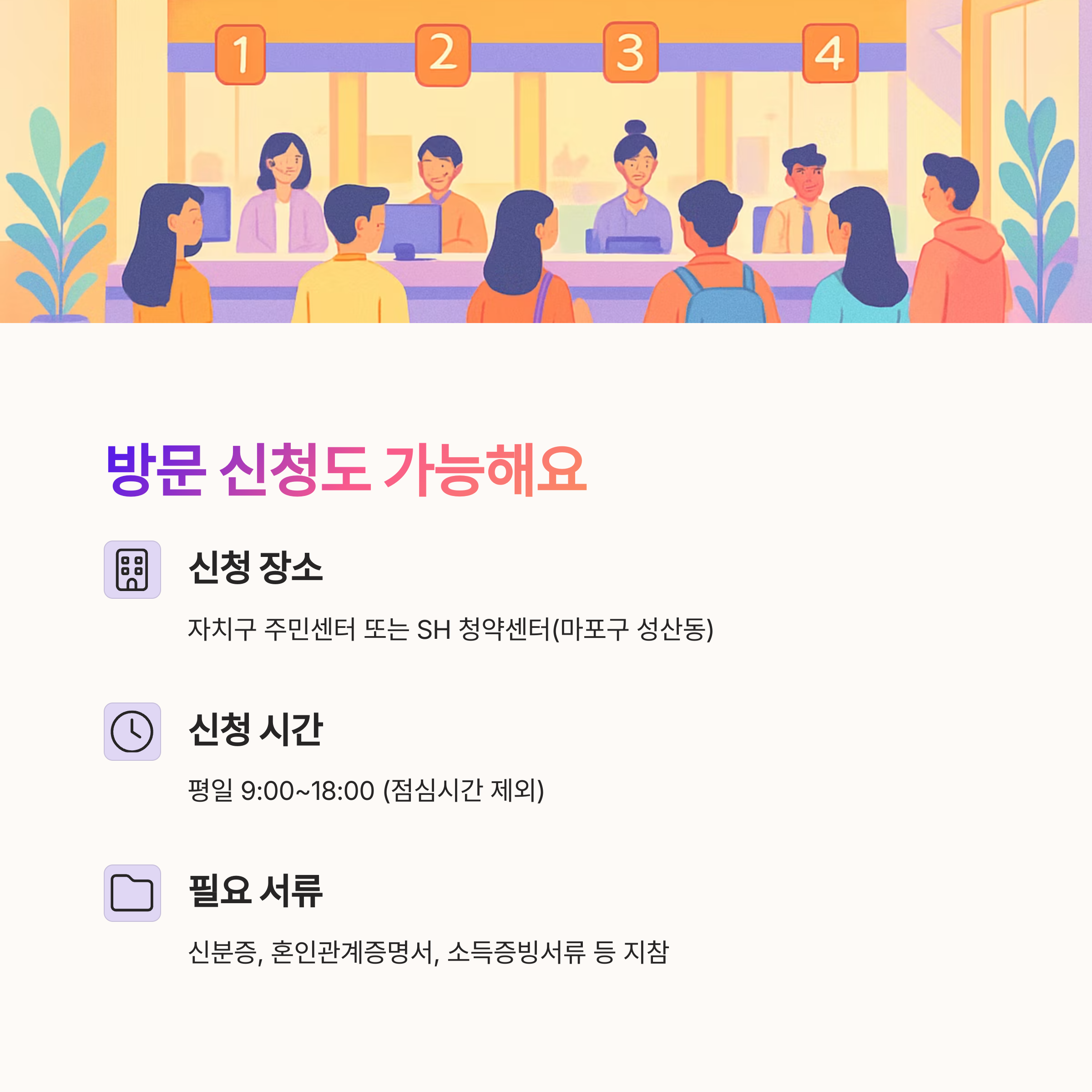- 자치구 주민센터 또는 SH 청약센터(마포구 성산동)