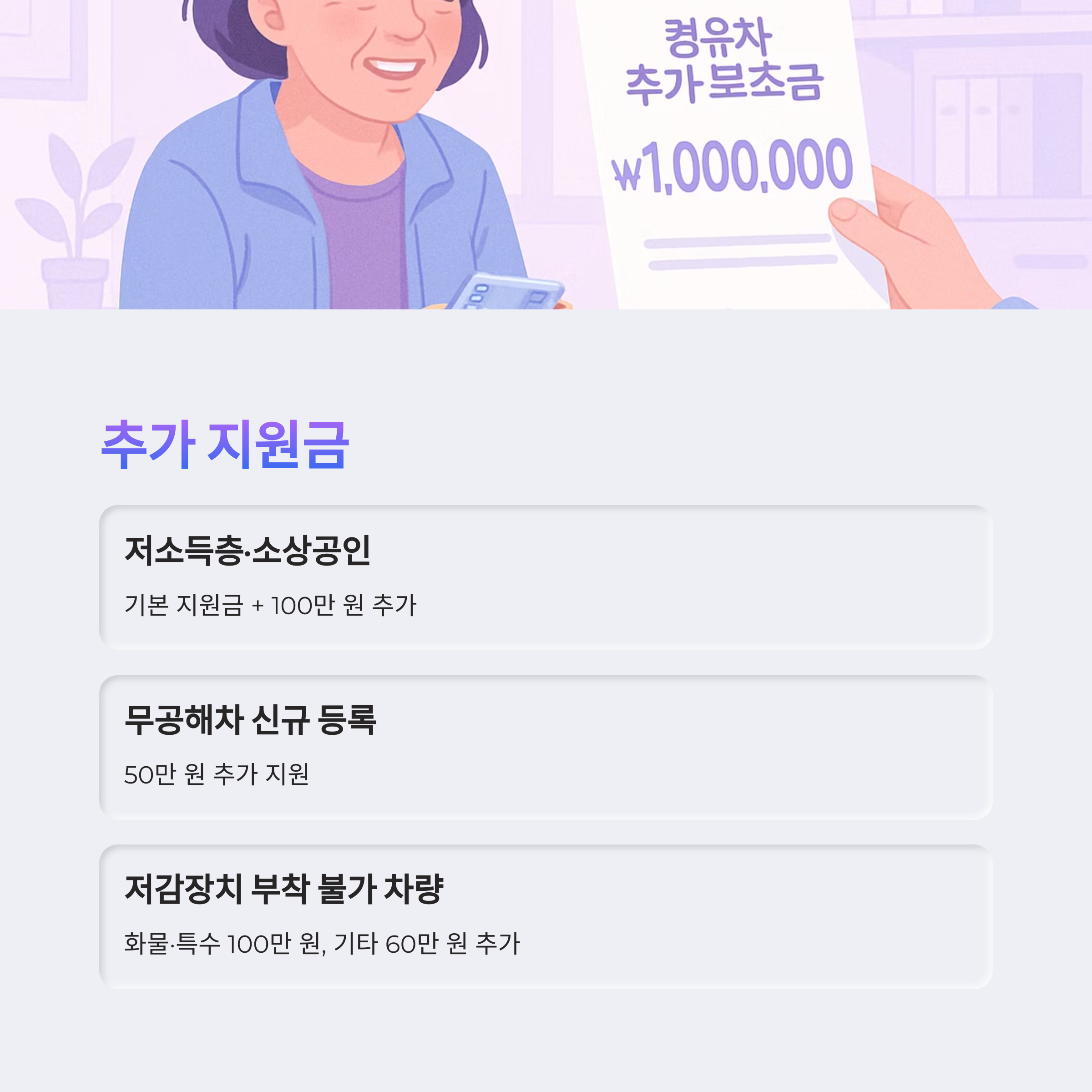- 저감장치 부착 불가 차량은 추가 지원: 화물·특수 100만 원, 기타 60만 원