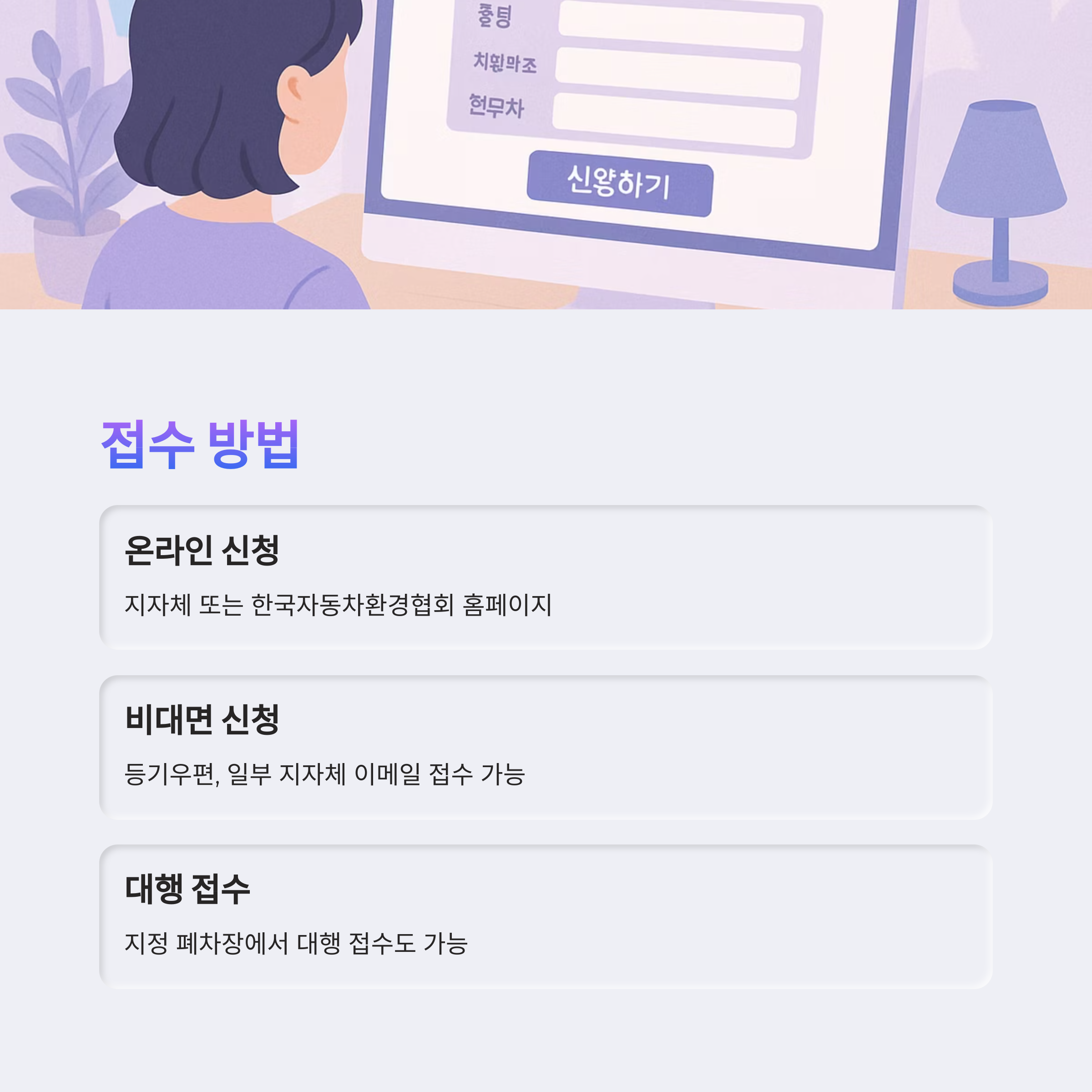 - 온라인 신청: 지자체 또는 한국자동차환경협회 홈페이지
