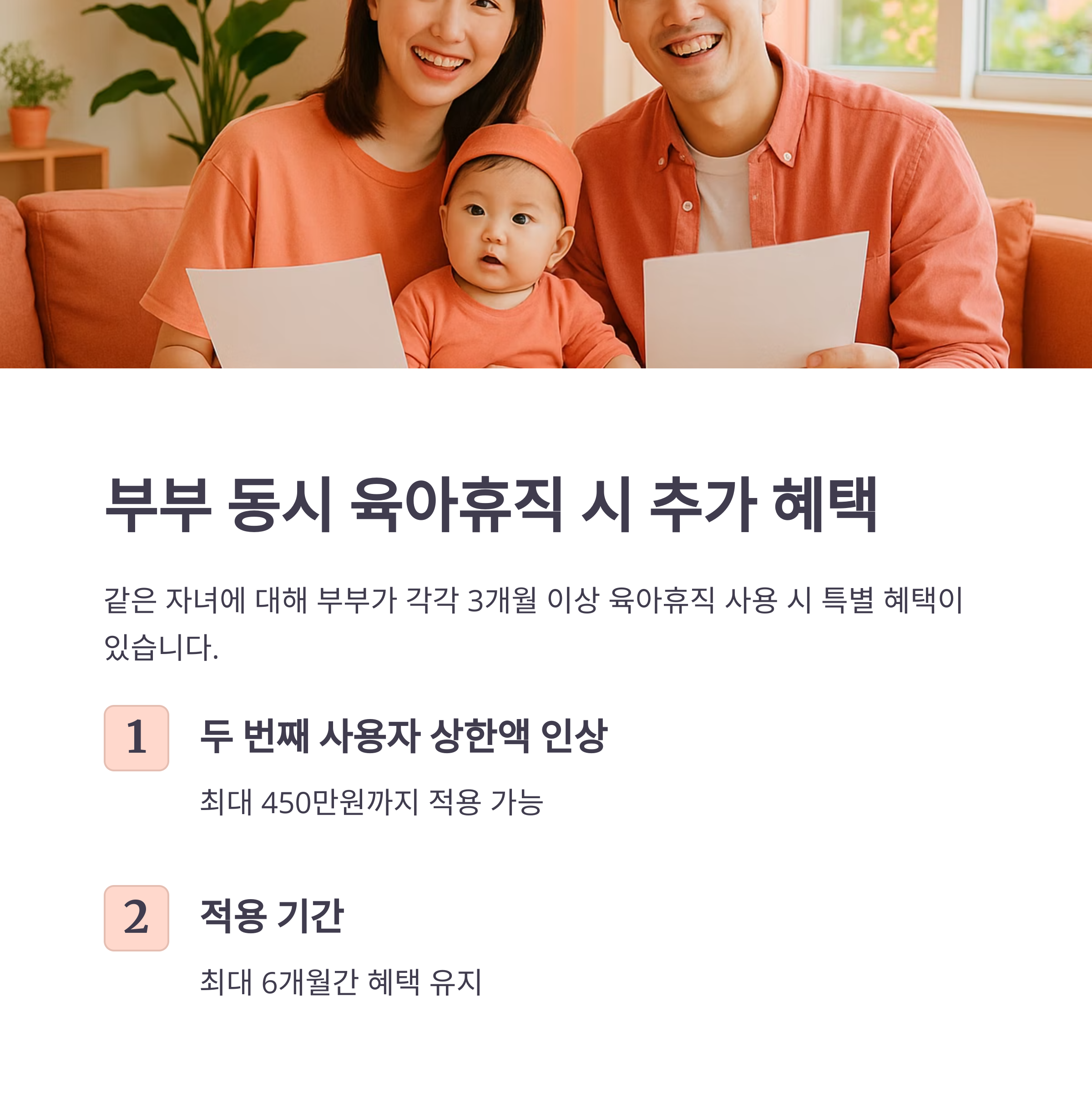 - 같은 자녀에 대해 부부가 각각 3개월 이상 사용하면, 두 번째 사용자는 상한액 최대 450만원까지 적용 가능 (최대 6개월)