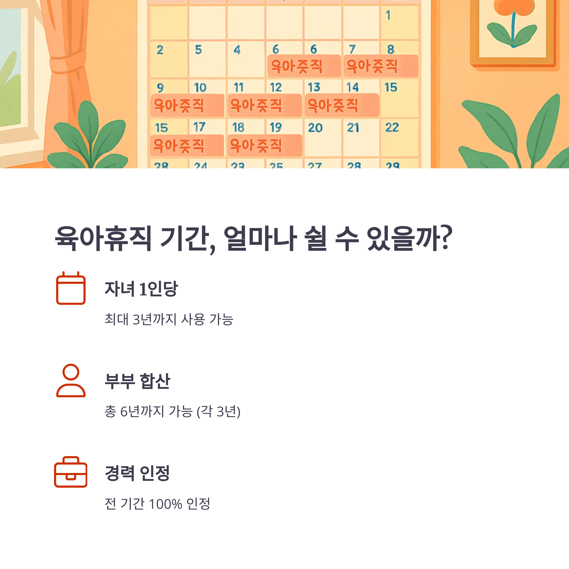 - 부모 각각 3년씩 사용 가능 (부부 합산 총 6년)