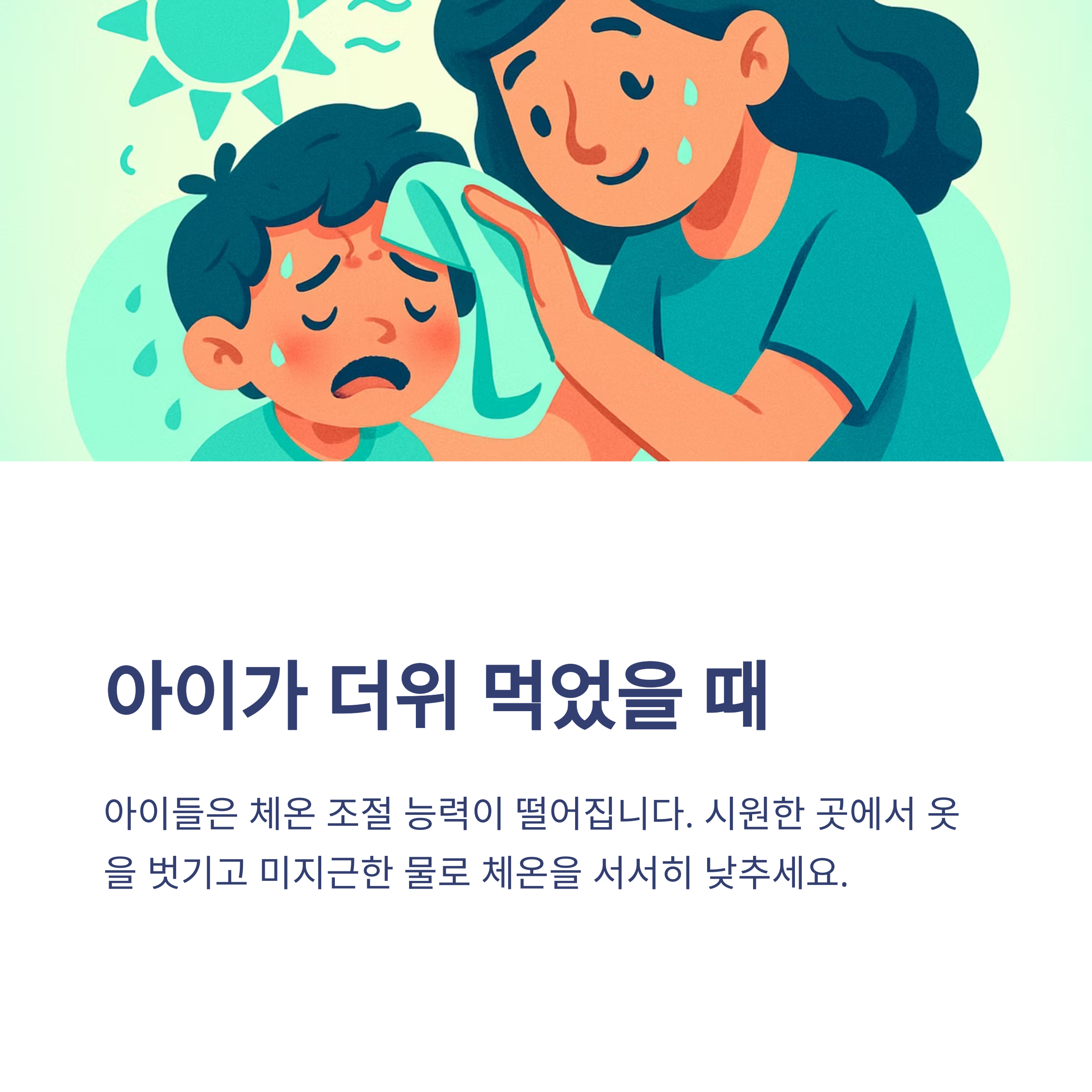 A2. 아이들은 성인보다 체온 조절 능력이 떨어지므로, 즉시 시원한 곳에서 옷을 벗기고 체온을 서서히 낮춰야 합니다. 미지근한 물로 샤워하거나 젖은 수건을 대고, 물은 천천히 조금씩 먹입니다. 심한 경우 즉시 소아응급실로 이동하세요.