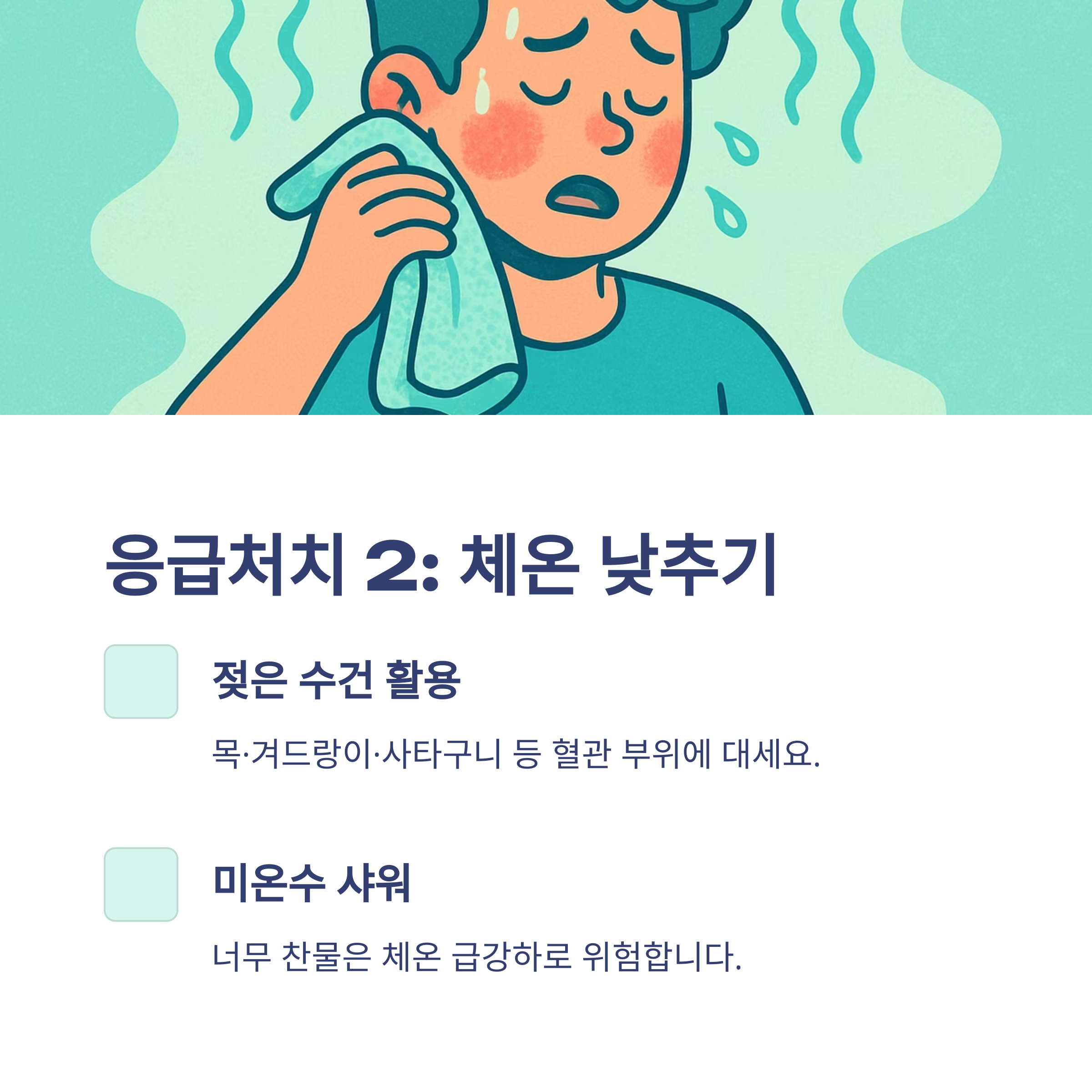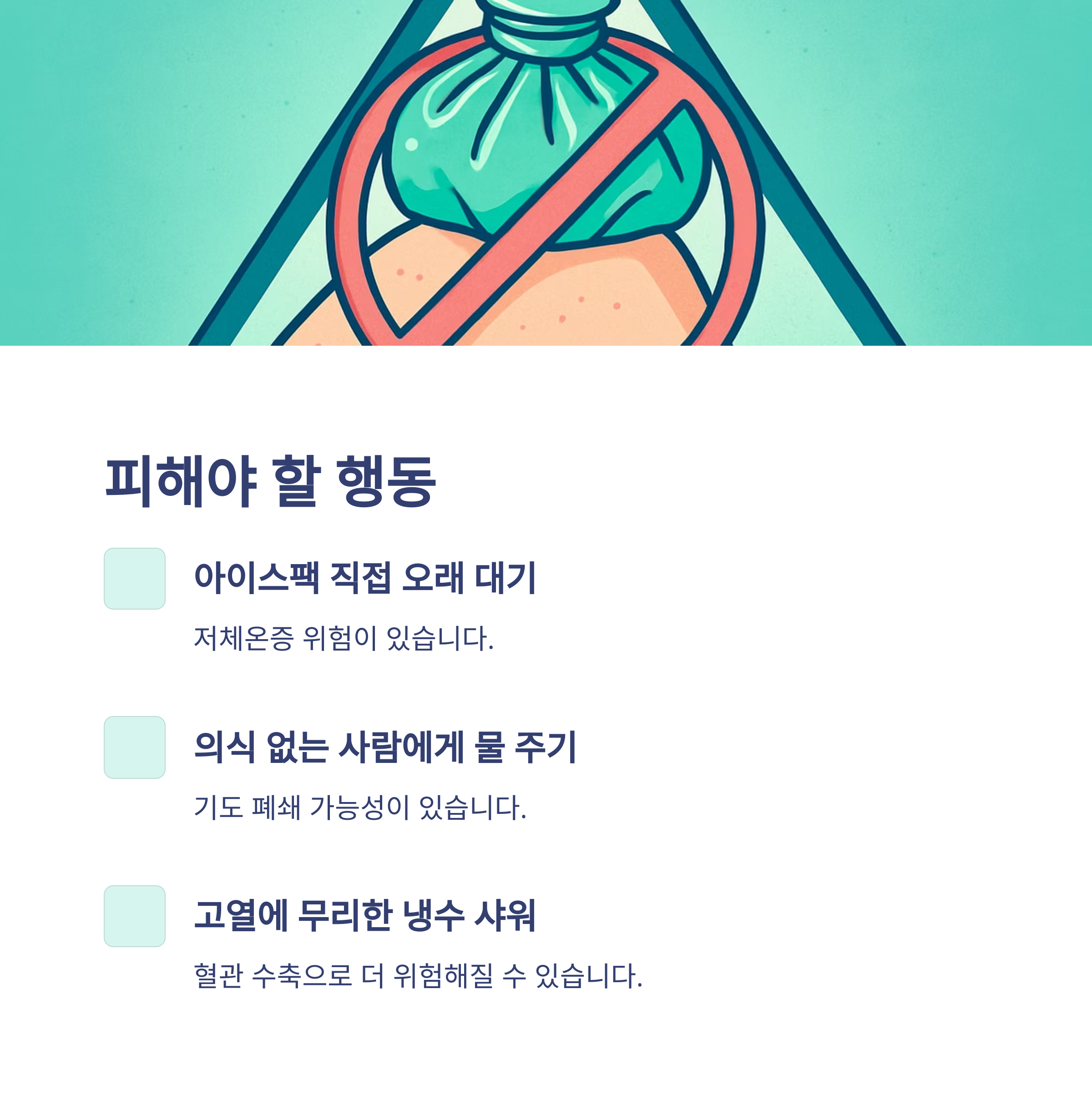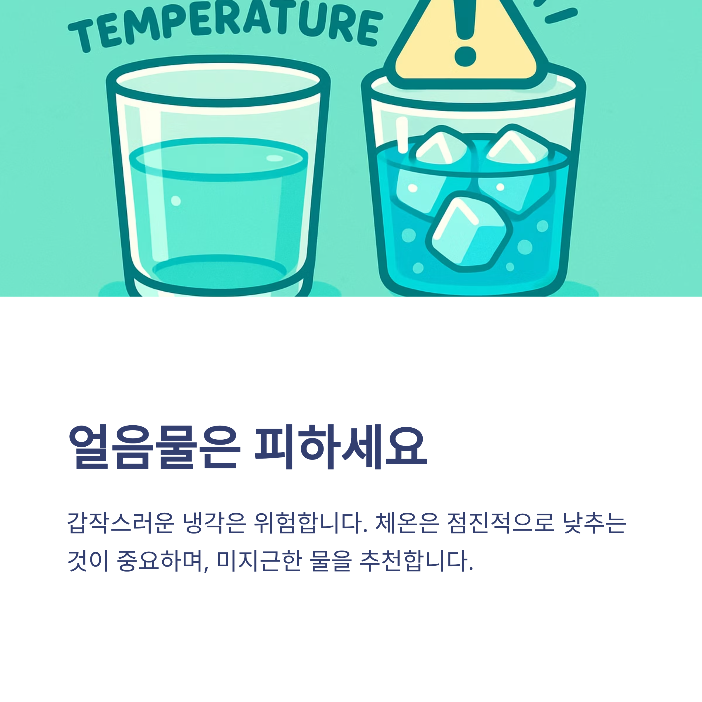 A3. 갑작스러운 냉각은 오히려 위험할 수 있습니다. 체온은 점진적으로 낮추는 것이 중요하며, 얼음물은 피하고 미지근한 물을 추천합니다.