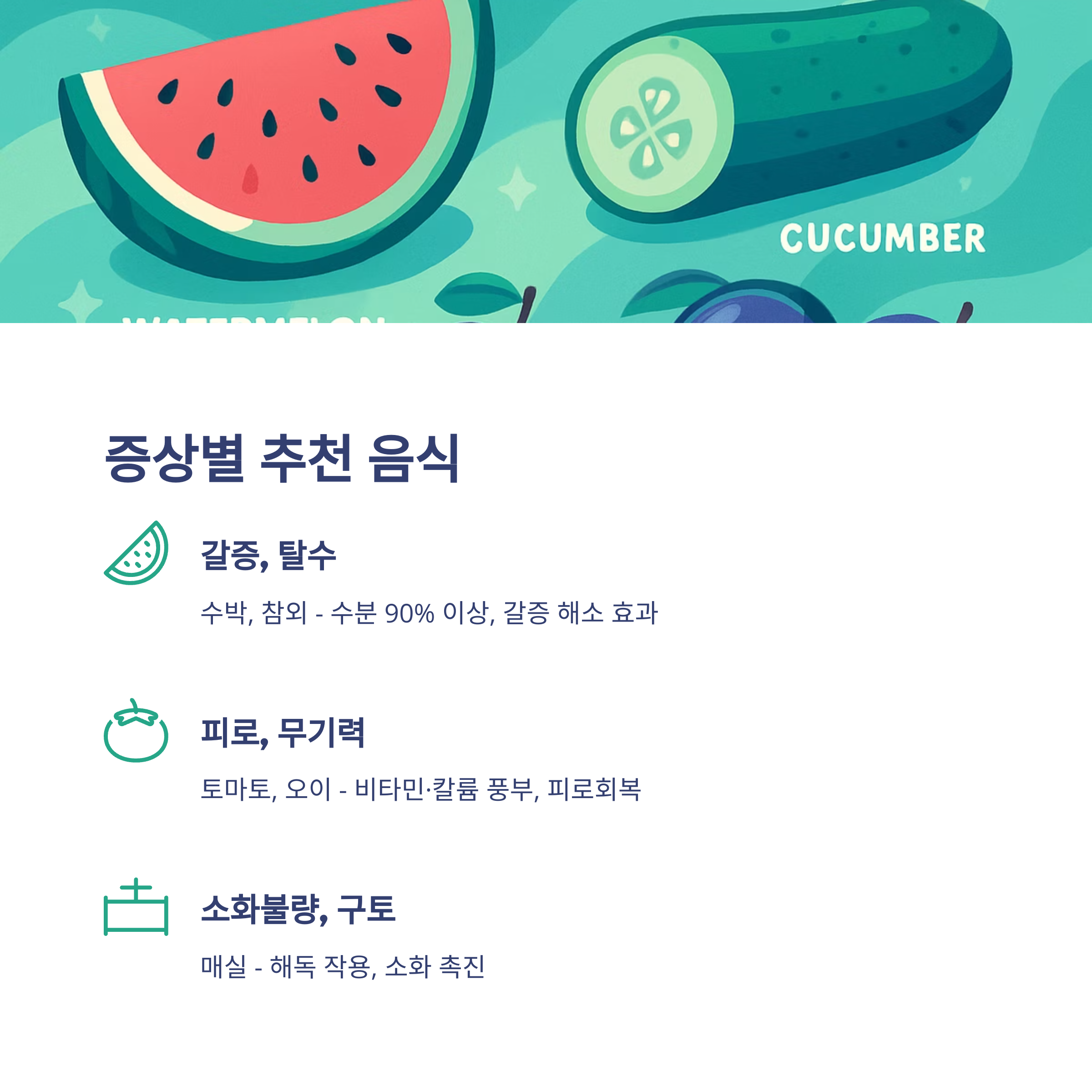 | 갈증, 탈수 | 수박, 참외 | 수분 90% 이상, 갈증 해소 및 해열 효과 |