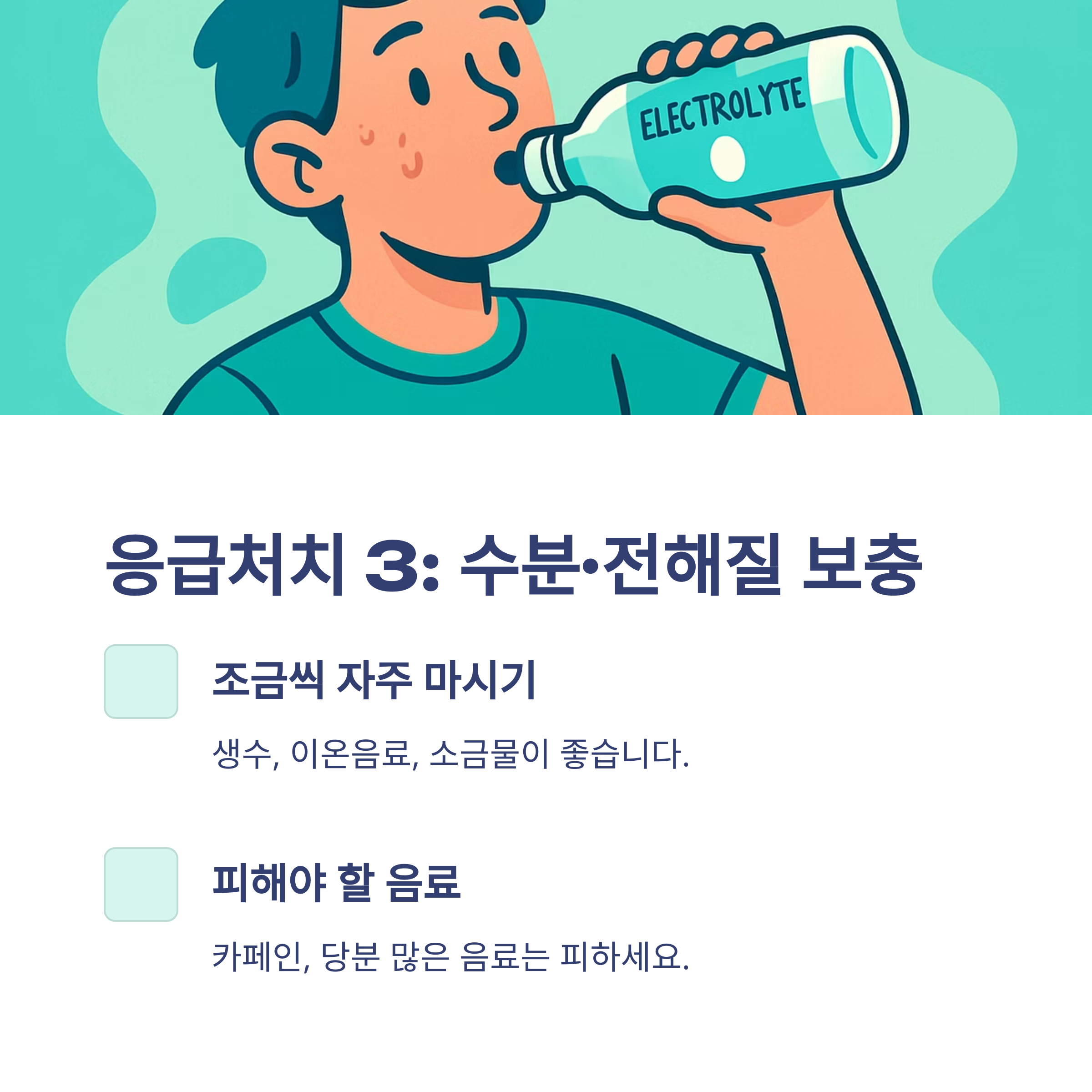 - 생수, 이온음료, 소금물 등 조금씩 자주 마시기