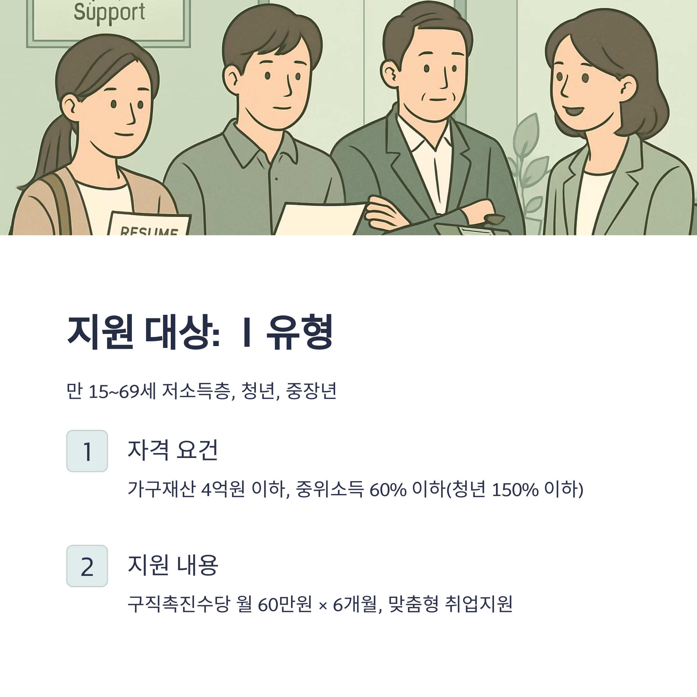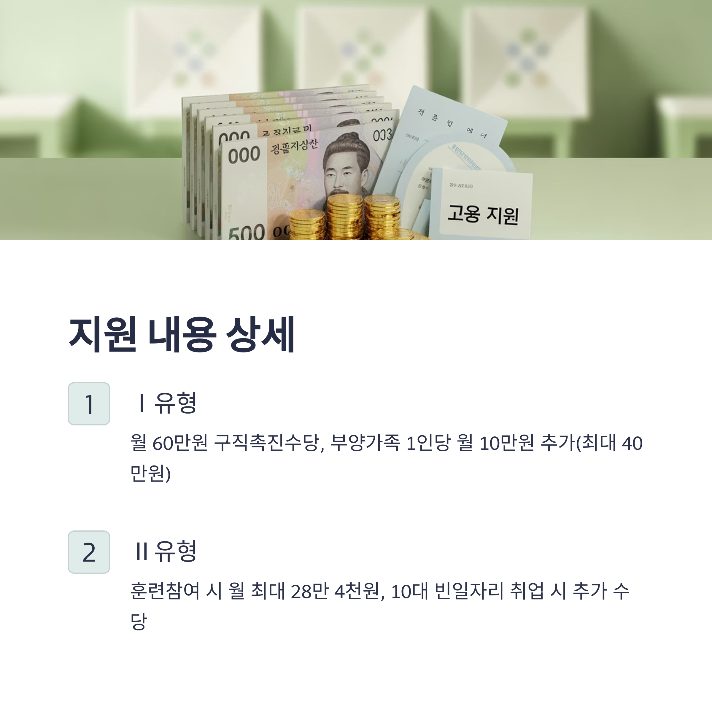 | Ⅰ유형 | 구직촉진수당 월 60만 원 (최대 6개월), 부양가족 1인당 월 10만 원 추가 지원(최대 40만 원) |
