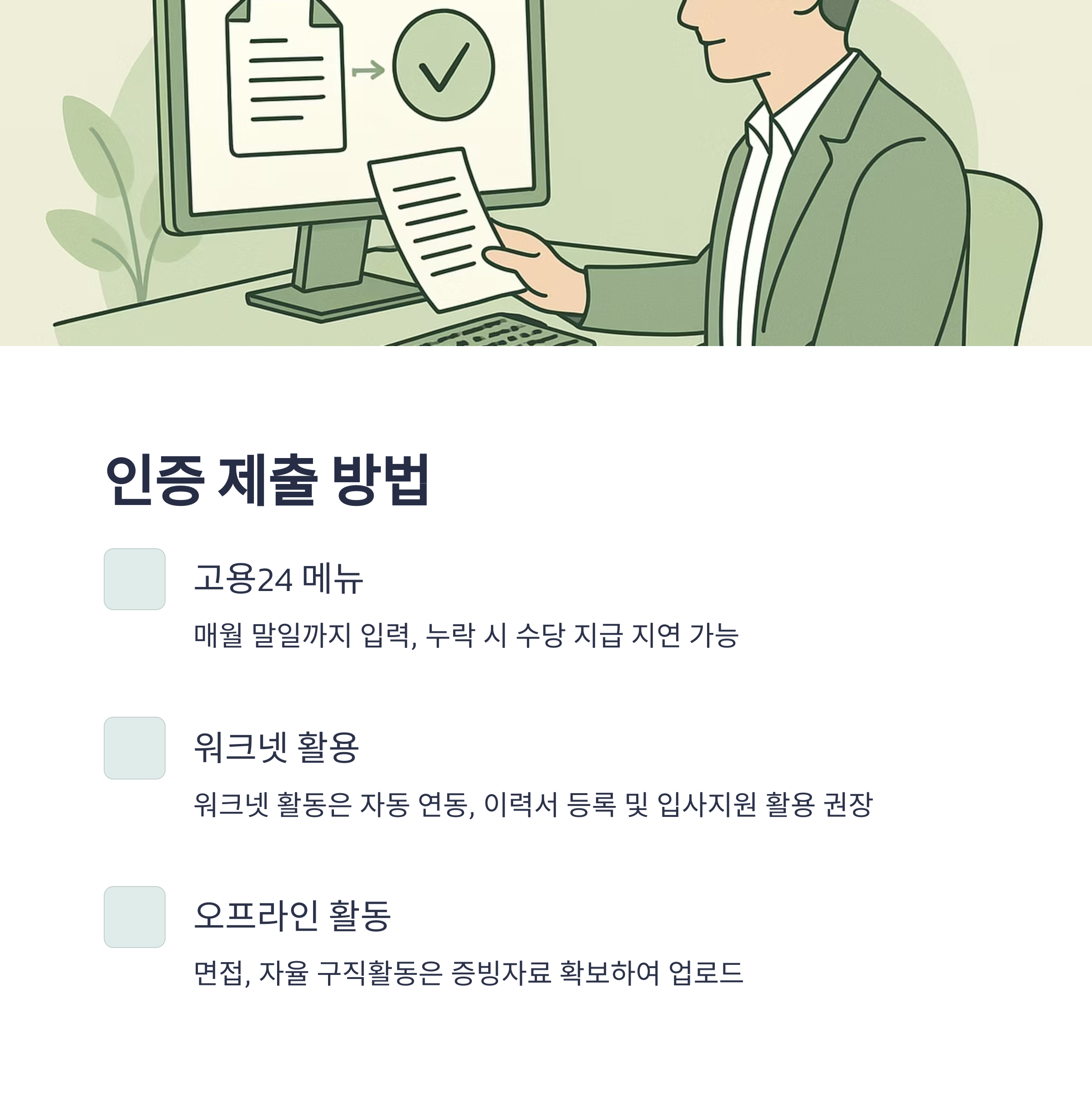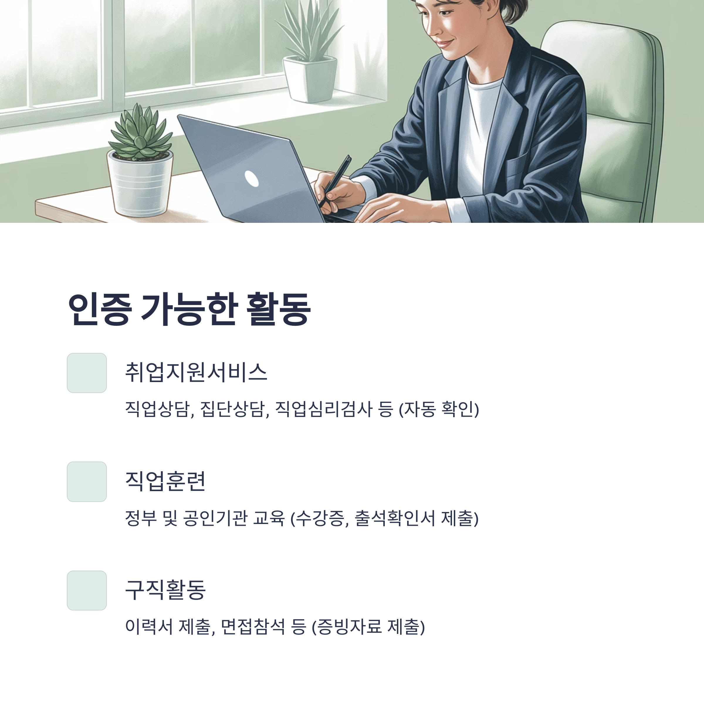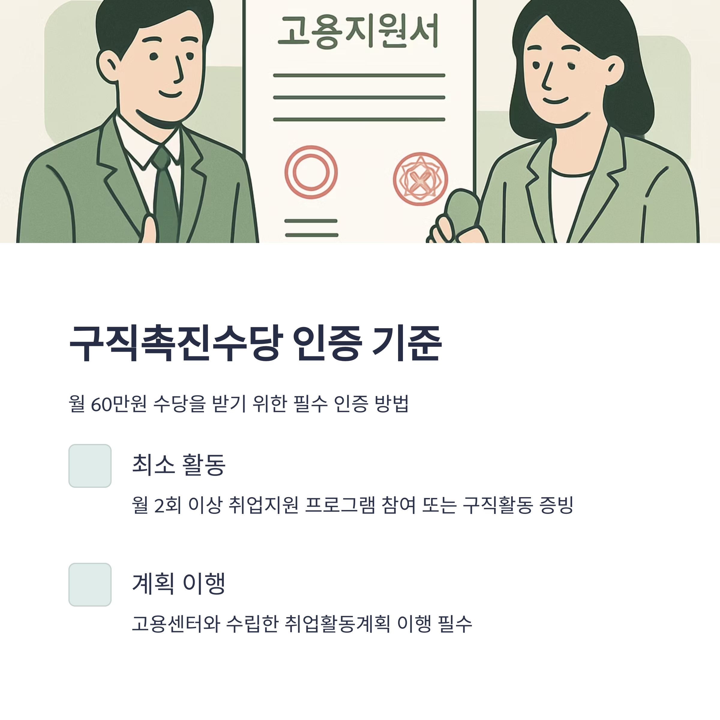 - 수당 지급 조건: 취업활동계획 이행 필수 (예: 월 2개 이상 취업지원 참여)