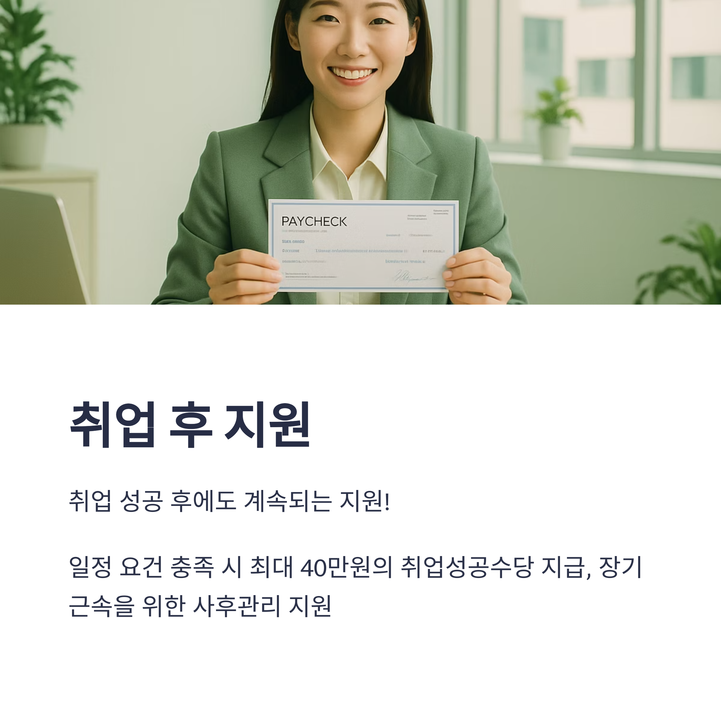 A. 일정 요건 충족 시 최대 40만 원의 취업성공수당이 지급되며, 장기근속을 위한 사후관리도 지원됩니다.