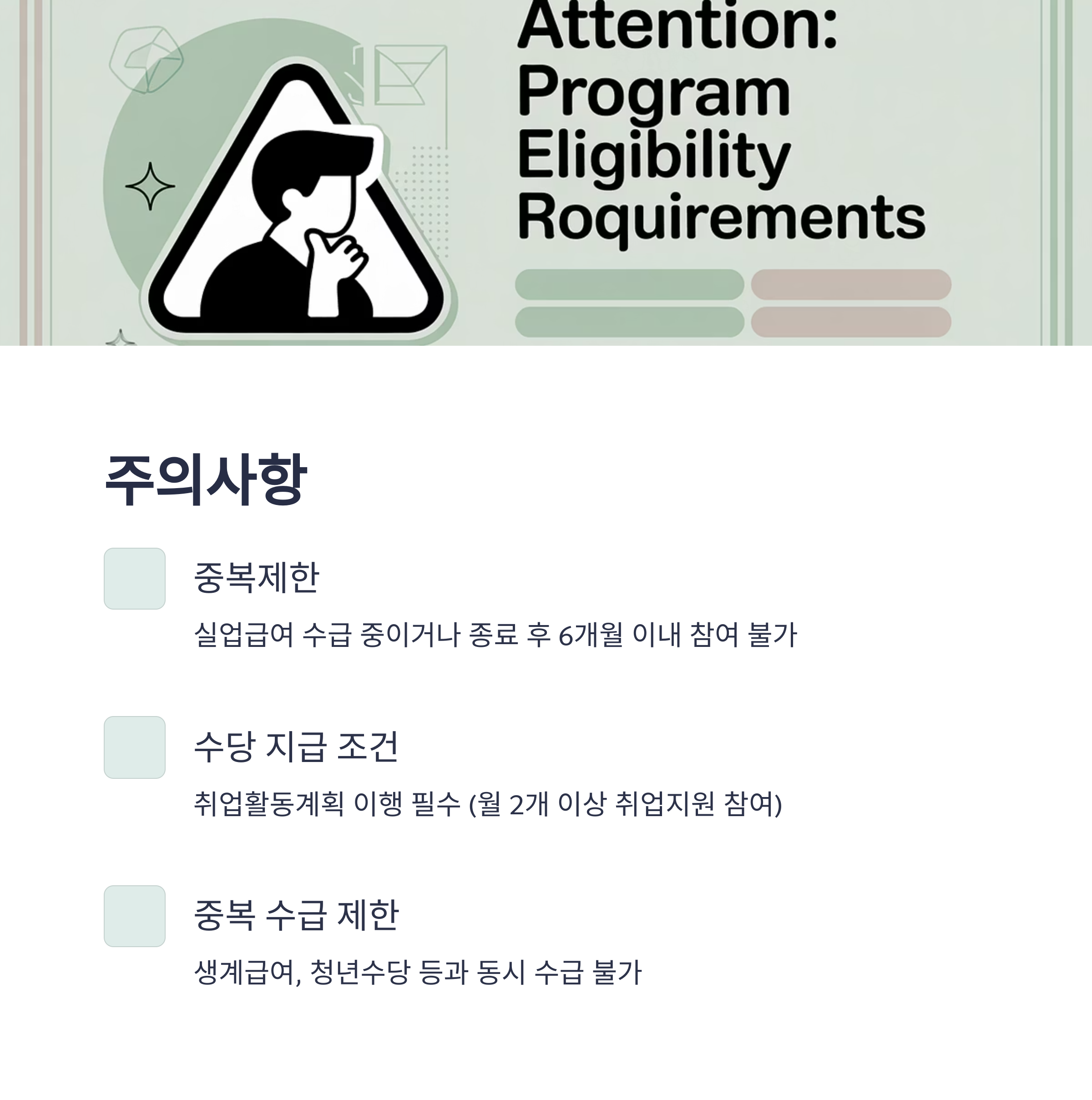 - Ⅰ유형 중복제한: 실업급여 수급 중이거나 종료 후 6개월 이내인 경우 참여 불가