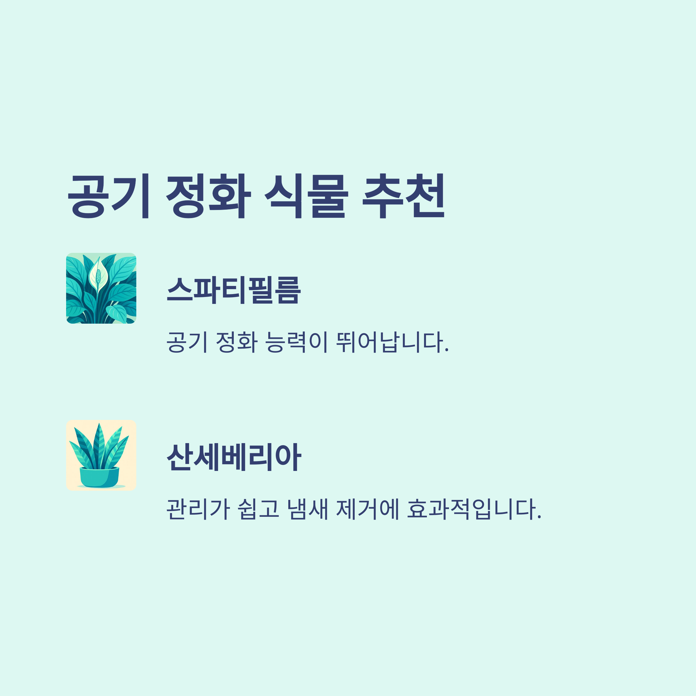 - 공기 정화 식물: 스파티필름, 산세베리아 추천